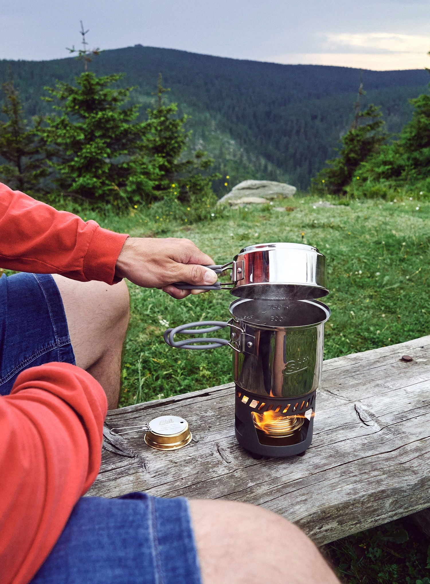 пальник, який є серцем всього набору з нержавіючої сталі 985 мл, має вбудовану, зручну та складну ручку носіння. Крім того, ви також знайдете коригування полум'я, яке дозволить вам повністю гасити полум'я. Після приготування ви можете скласти всі елементи Esbit одна всередині одного і помістити їх у спеціальну сітчасту обкладинку.