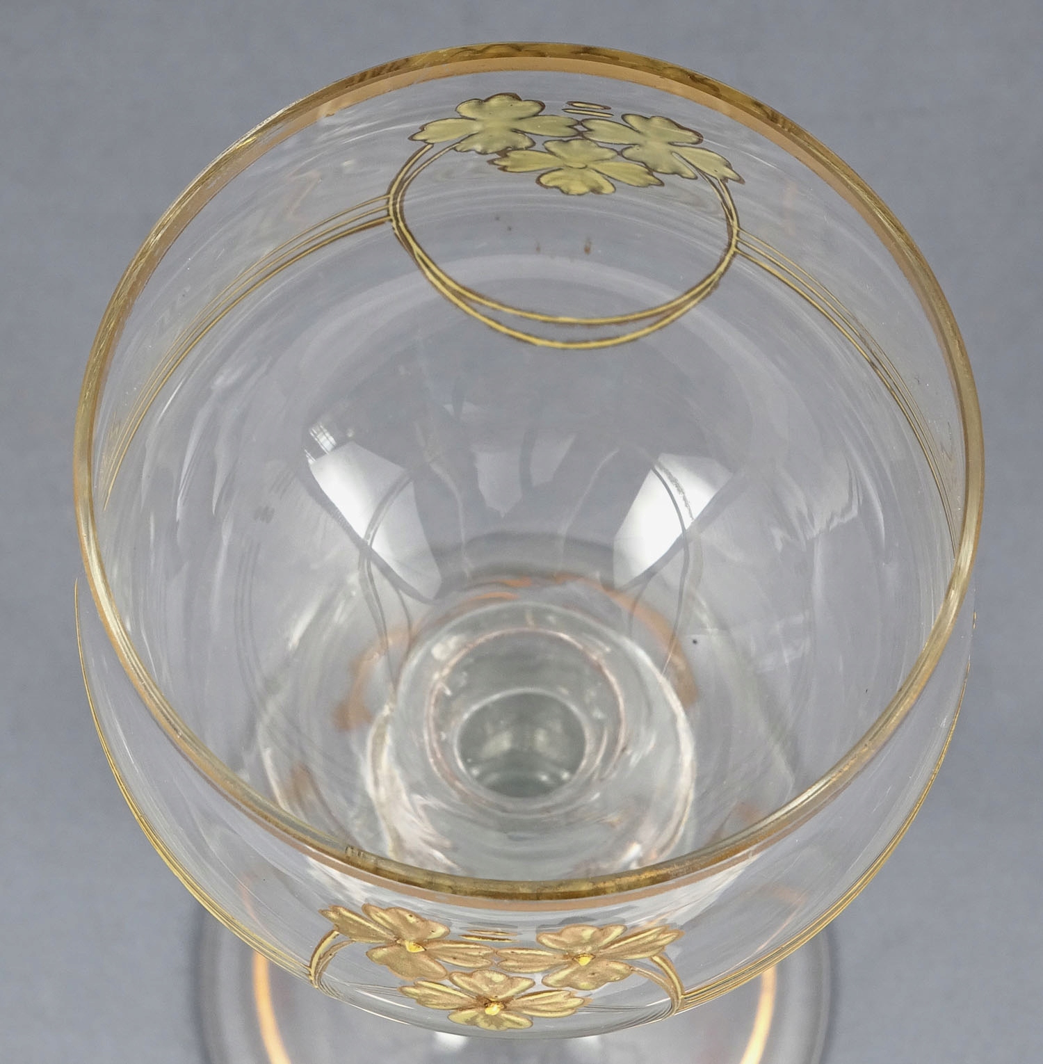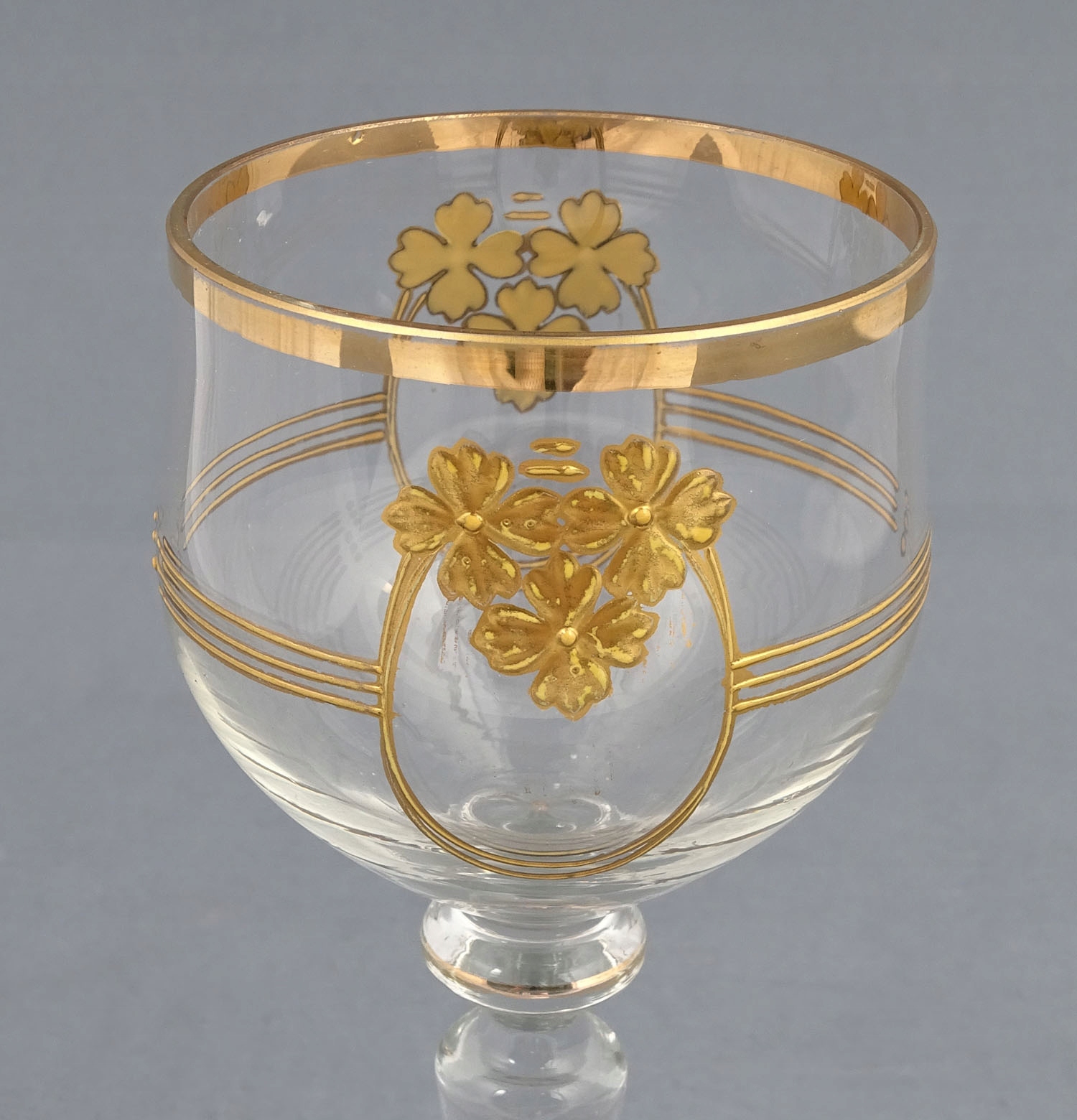Келихи з круглою основою, тонкою, злегка розширеною ніжкою, із звуженням у верхній частині. Угорі — чаша з двома овальними полями, прикрашеними квітами, з’єднаними трьома тонкими лініями. Край позолочений ширшою смугою.