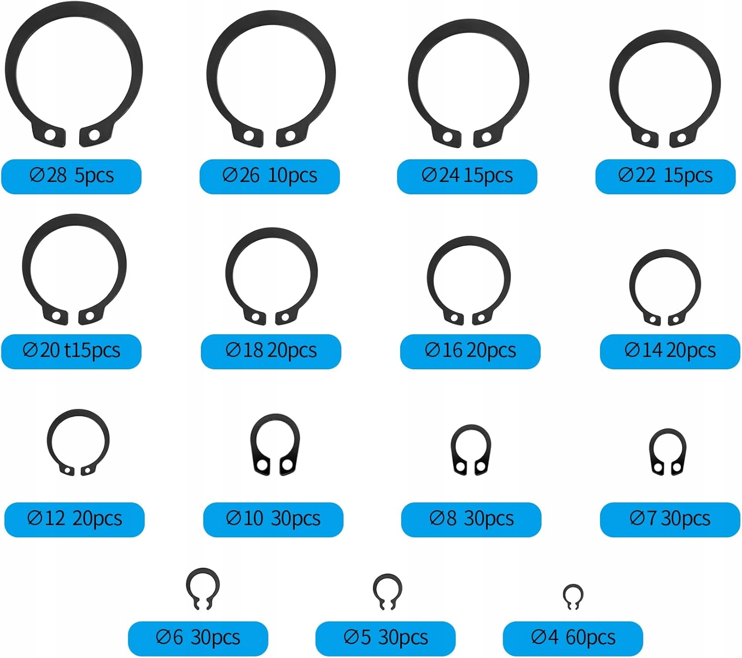 У набір входить 350 кілець 15 популярних розмірів (від 4 мм до 28 мм), що дозволяє підібрати потрібний елемент для кожного завдання.
