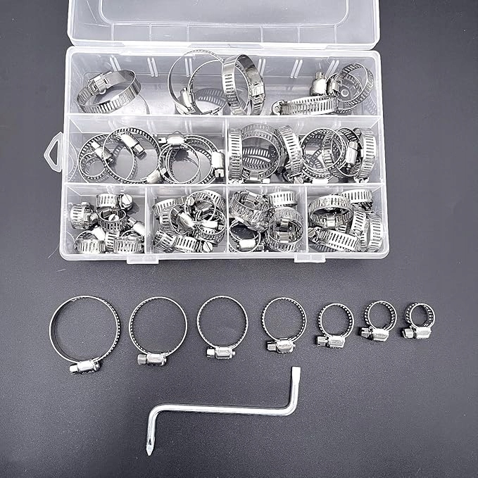 - Високоякісний набір черв'ячних затискачів з нержавіючої сталі. Набір регульованих затискачів для шлангів, труб, кабелів, паливопроводів.
