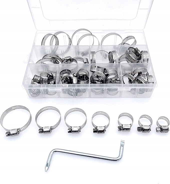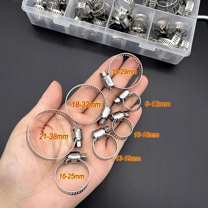 - У комплект входить: коробка з хомутами для шлангів різних розмірів: 8-12 мм (10 шт.), 10-16 мм (10 шт.), 13-19 мм (10 шт.), 16-25 мм (10 шт.), 19-29 мм (10 шт.), 22-32 мм (5 шт.), 25-38 мм. ковпачок.