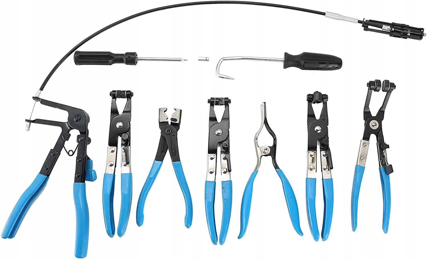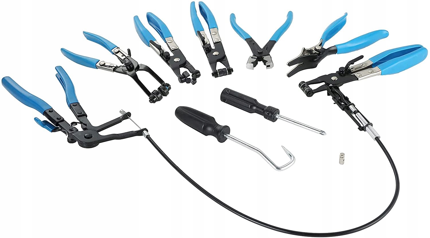 - Зігнуті щипці для вузьких затискачів - дозволяють одягати і знімати затискачі у важкодоступних місцях. Вигнуті губки та обертові наконечники дозволяють захоплювати ремінець під різними кутами кріплення. Вони також мають фіксатор затискача, що робить роботу безпечною.