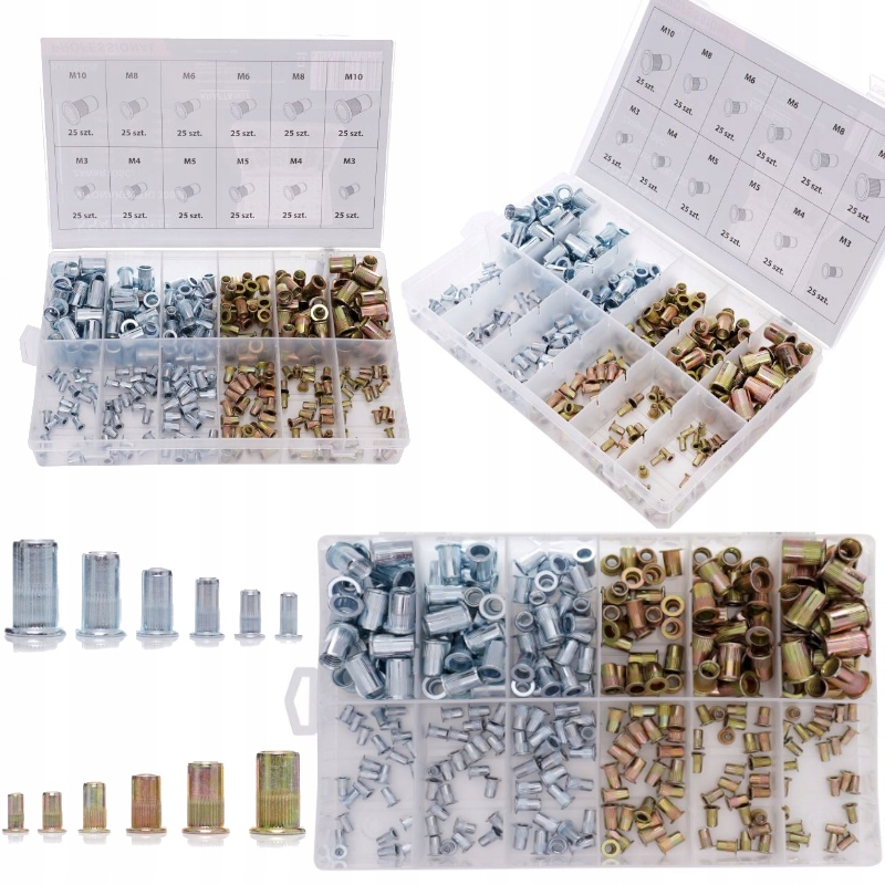 Набір заклепувальних гайок, упакованих у практичну зручну коробку, яка дозволяє організовувати заклепувальні гайки відповідно до їхніх розмірів. Повний перелік розмірів і моделей, що входять до набору, можна знайти на упаковці.