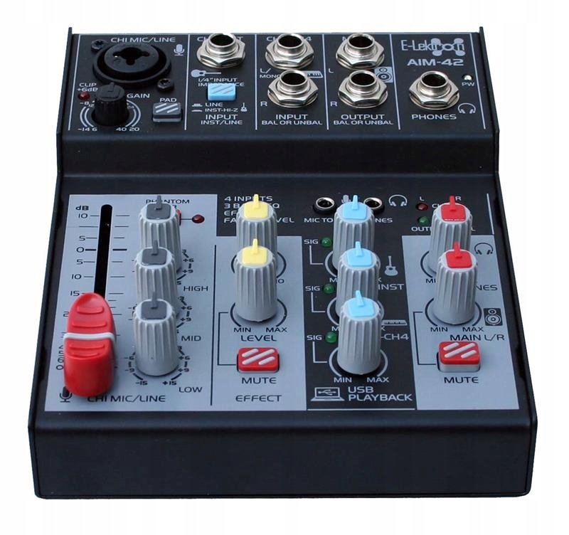 - Мікрофон каналу, оснащений глушником, 3-х напрямним коректором, ефектом залу/ехо та фантомним джерелом живлення