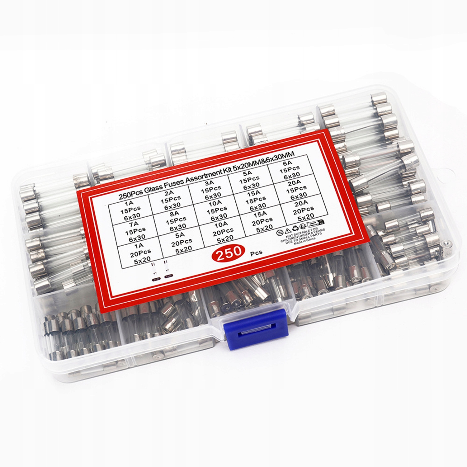 Набір із 15 швидкоз’ємних скляних запобіжників, 250 шт., 6 x 30 мм, 250 В, 1 A, 2 A, 3 A, 5 A, 6 A, 7 A, 8 A, 10 A, 15 A, 20 A, 5 x 20 мм, 250 В, 1 A, 5 A, 10 A, 15 A, 20 A, у прозорій пластиковій коробці