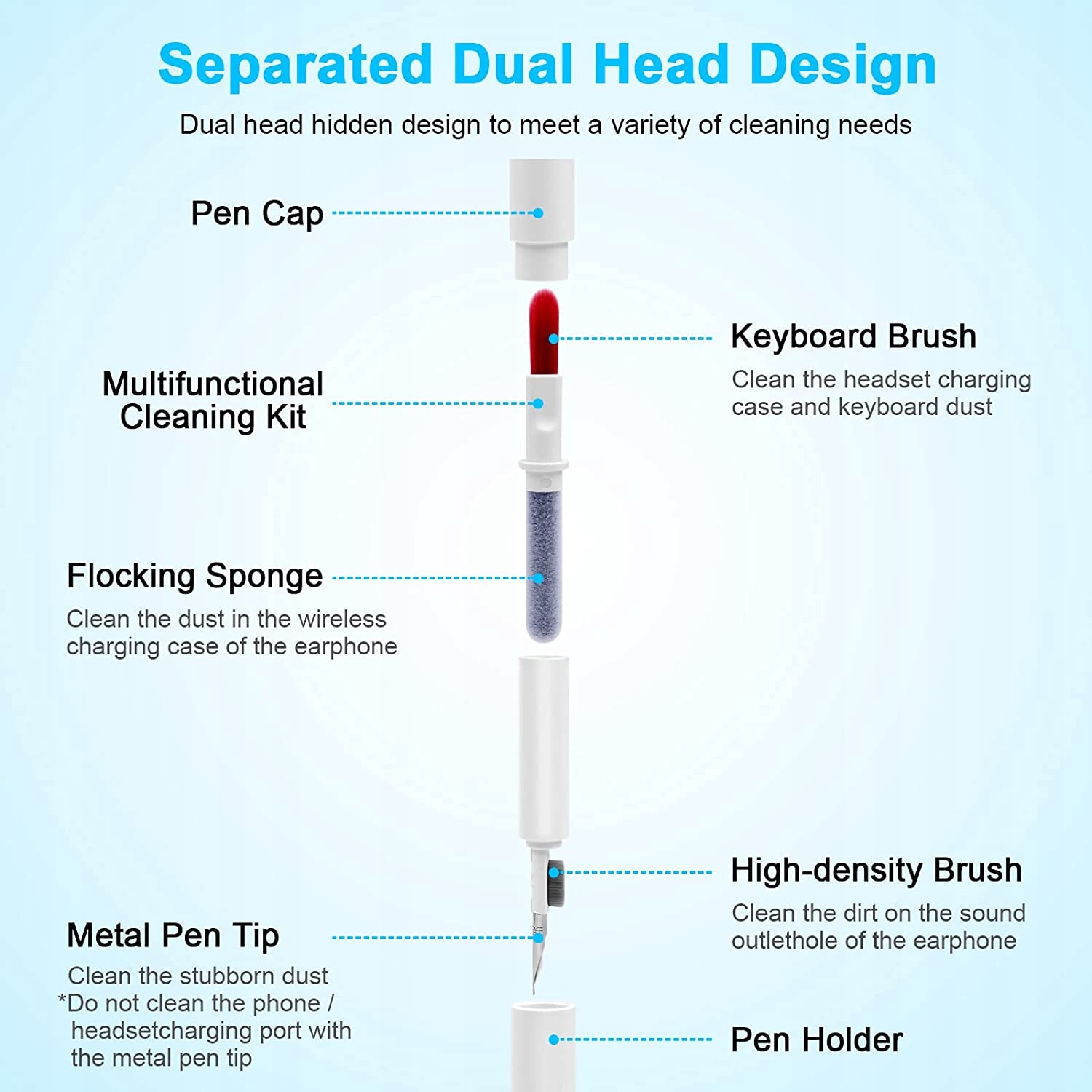 Використовуйте кінчик ручки, щоб очистити від пилу та сміття коробку для навушників Bluetooth або щілину для навушників, а потім скористайтеся щіткою високої щільності збоку, щоб видалити зішкрябане сміття. Ворсистою губкою можна глибоко очистити бруд і пил у коробці з гарнітурою Bluetooth.