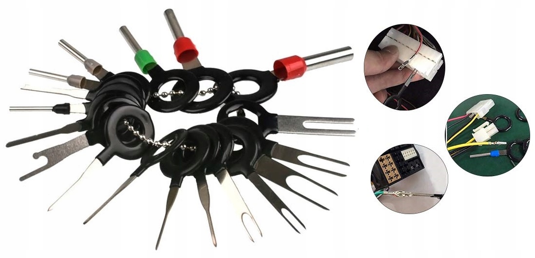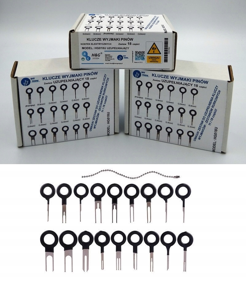 Пропонований набір ключів /wyjmaków HG0119 є основним інструментом як для професіоналів, так і для аматорів ремонту електрики та електроніки автомобіля, мотоцикла чи іншого транспортного засобу. Завдяки гайковим ключам і виштовхувачам, що входять в комплект, ви можете легко вийняти штирі в будь-якій вилці або роз'ємі з електроустановки. Зламаний PIN-код у вилці або погнута контактна пластина в роз'ємі - тепер це не проблема! Ми пропонуємо вдосконалений і збільшений набір з 18 елементів!