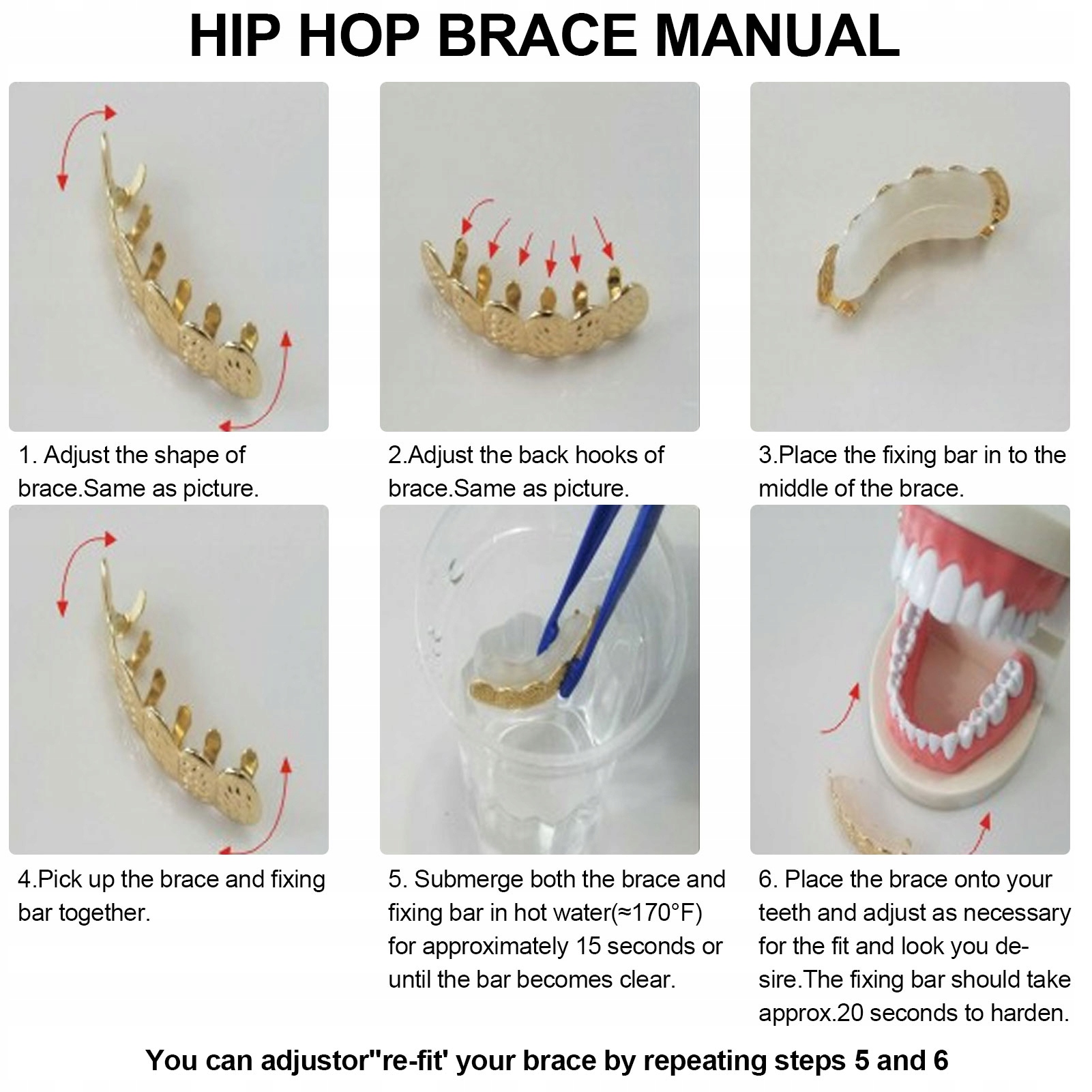 - Рекомендації щодо використання: Носіть ортодонтичний прилад, клейте його два -три рази і звикайте до нього. Під час їжі видаліть ортодонтичний прилад. Зберігайте гігієну ротової порожнини. Помістіть білий віск у канавки золотих зубів. Вставте золоті зуби (срібні зуби) разом з пінцетом до фіксаційного воску до гарячої води при 70-80 ℃ і просочуйте його приблизно 15-30 секунд, щоб фіксуючий віск став м'яким. (Зверніть увагу, не використовуйте окропу або киплячу воду, інакше нерухомий віск просочений і стає марним)