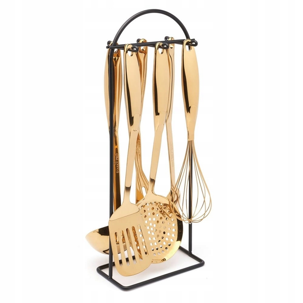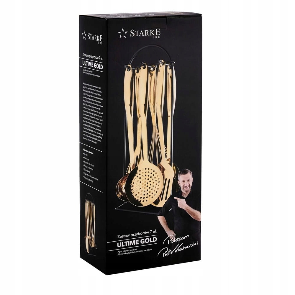Набір елегантного кухонного посуду від виробника Starke Pro - це, безумовно, сучасне кухонне обладнання, яке вражає не тільки своїм зовнішнім виглядом, але і кількістю продуктів в упаковці. Він складається з підставки та 6 надзвичайно корисних кухонних аксесуарів. Золотий кухонний посуд робить приготування їжі не тільки легким, але й приємним. Це повний пакет, який порадує вас своєю універсальністю та універсальністю.