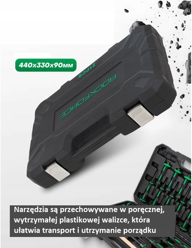 - Інструменти зберігаються в зручному, міцному пластиковому кейсі, що полегшує транспортування та підтримку порядку.