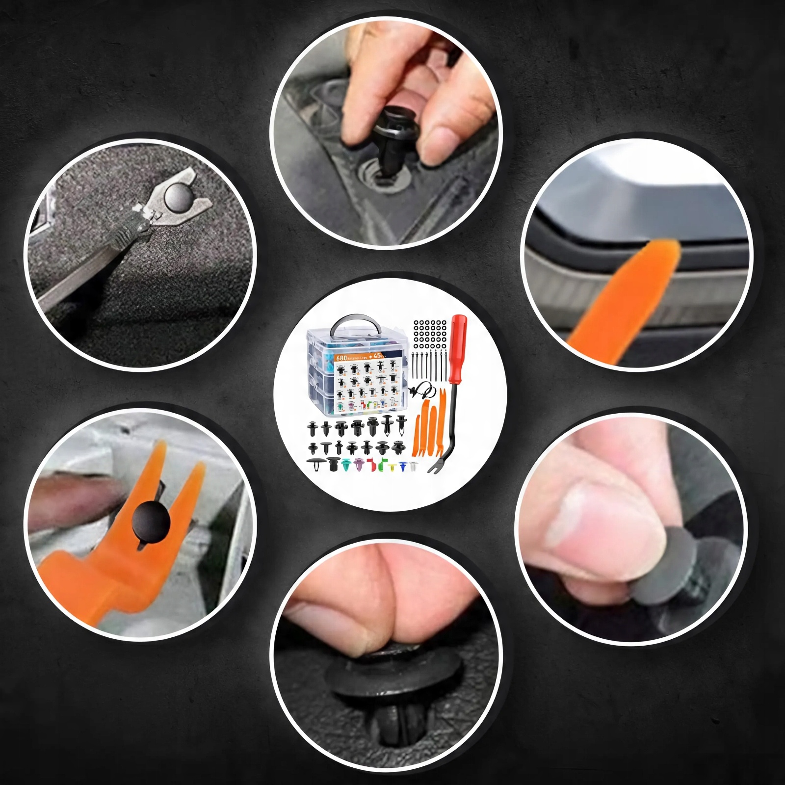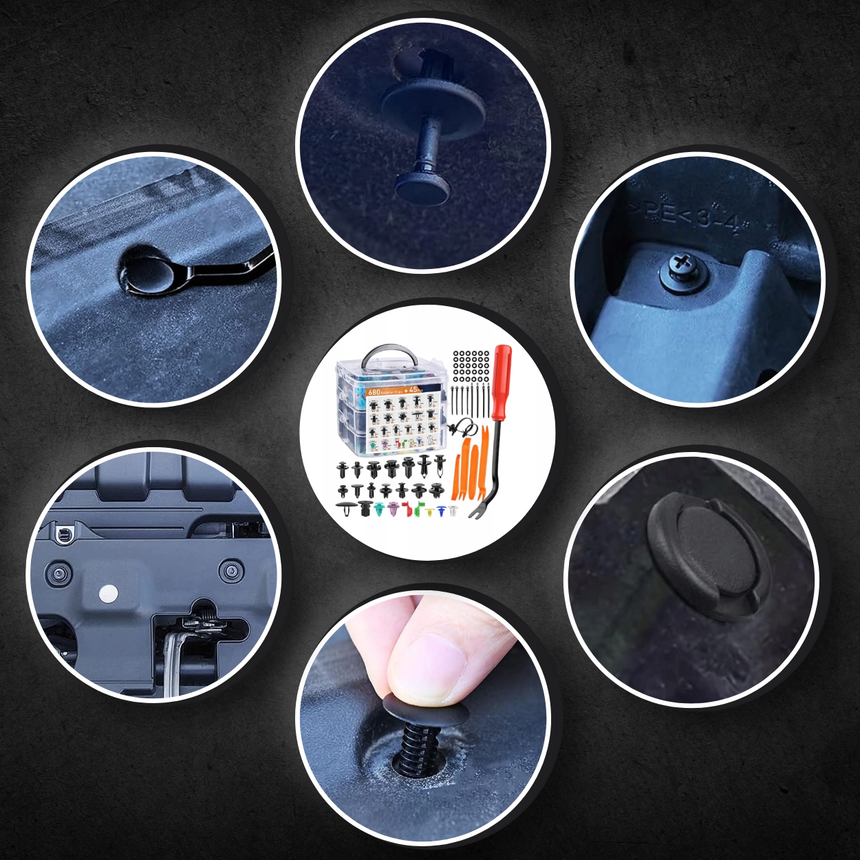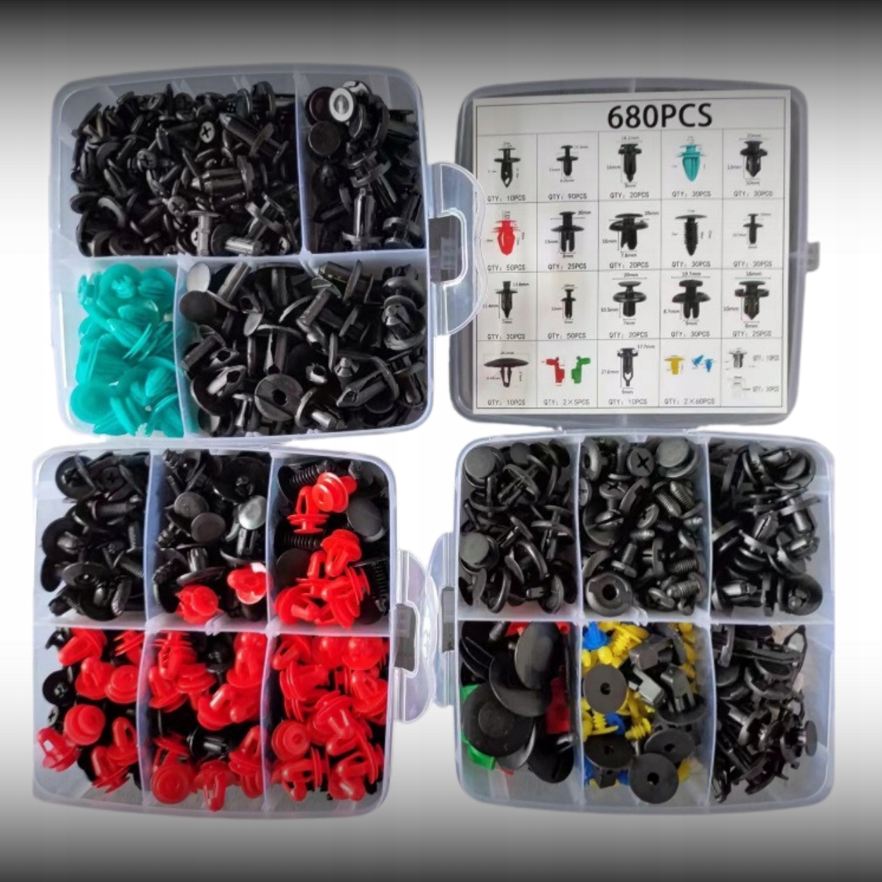 ⭐ Набір з 680 ЕЛЕМЕНТІВ + +45 ЕЛЕМЕНТІВ ТА ІНСТРУМЕНТІВ, який включає 23 найпопулярніші розміри затискачів і кріпильних конекторів . Набір доповнено інструментом для зняття затискачів.