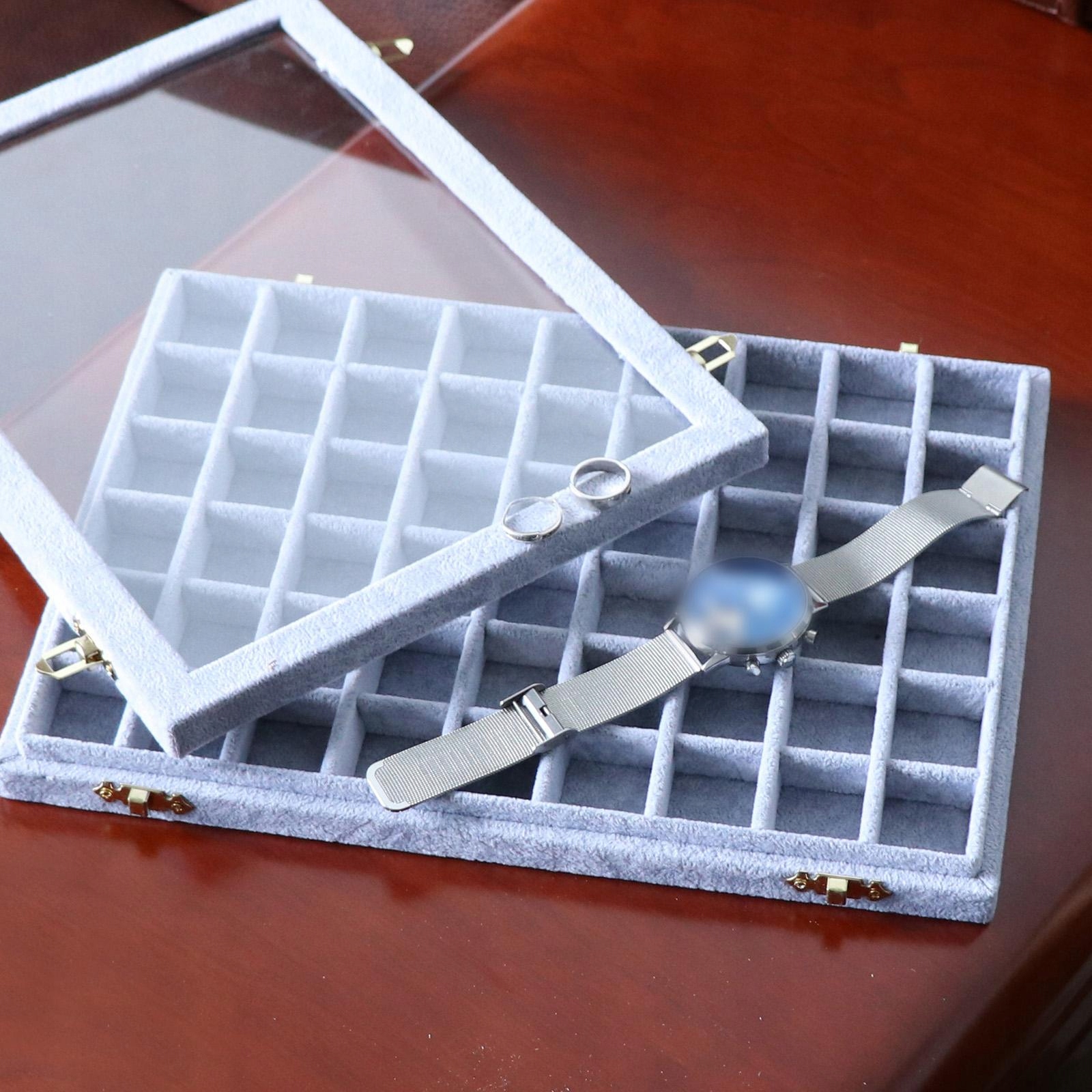 Виготовлений із міцної композитної дошки, загорнутої у високоякісну оксамитову тканину, зі знімними відділеннями та скляною кришкою для впорядкування та захисту прикрас і аксесуарів.
