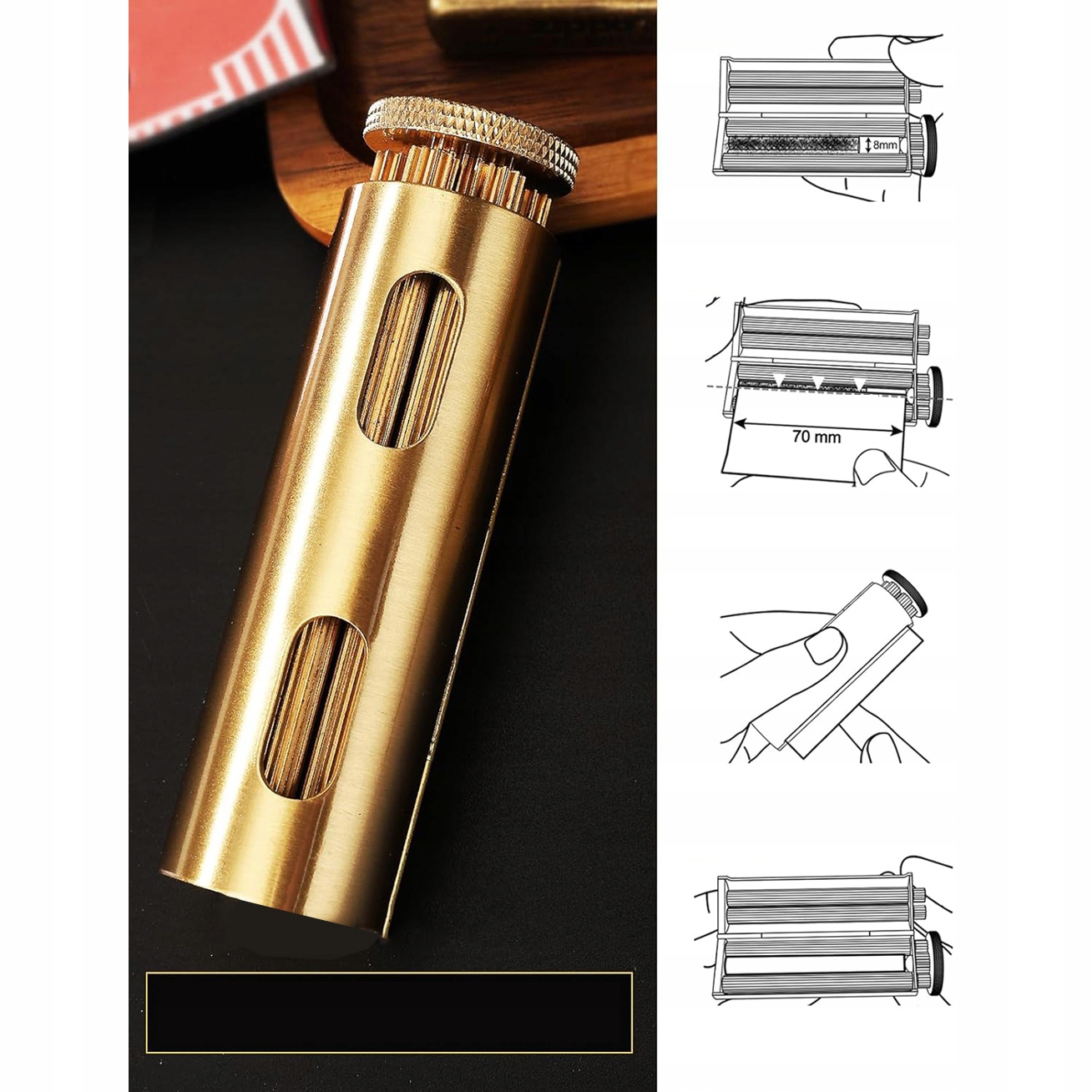 Кожен елемент цієї машини для скручування сигарет, розробленої з увагою до естетики ретро, виготовлено з міцної латуні, що забезпечує її довговічність. Елементи конструкції та шестерні ідеально підібрані, що робить машину привабливою з першого погляду.