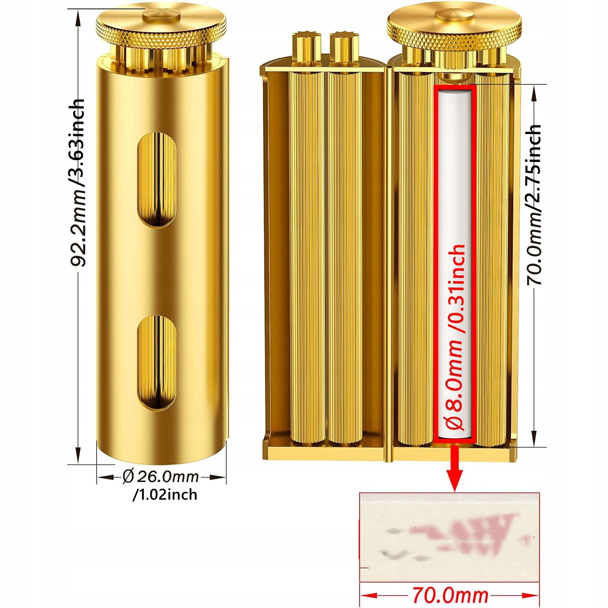 Апарат із розмірами92,2 x 26 мм вміщує цигарковий папір довжиною до70 мм. Використовується для скручування сигарет довжиною до 70 мм і діаметром до 8 мм. У набір входить сумка для зберігання, яку зручно носити.