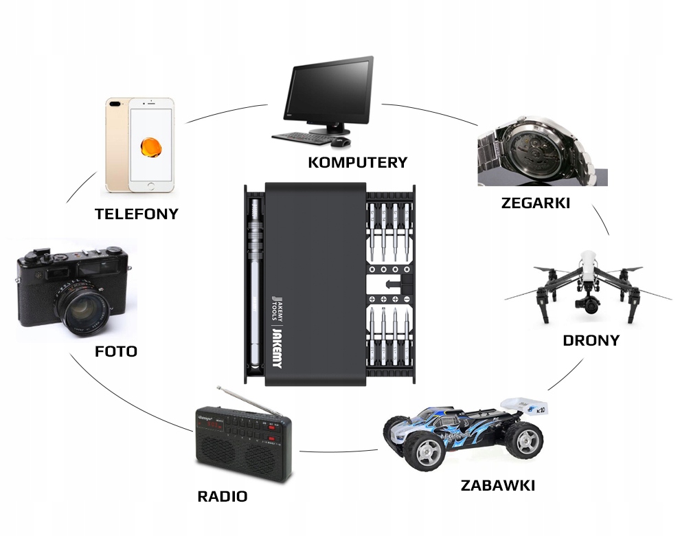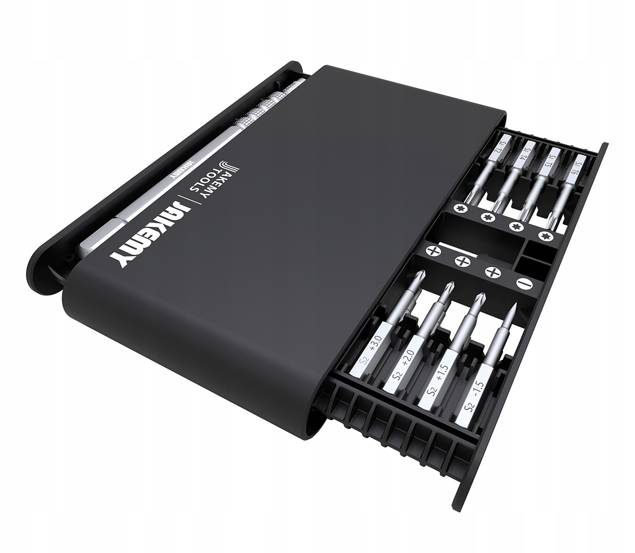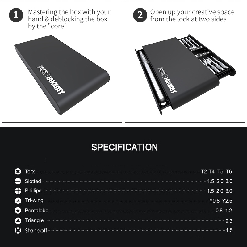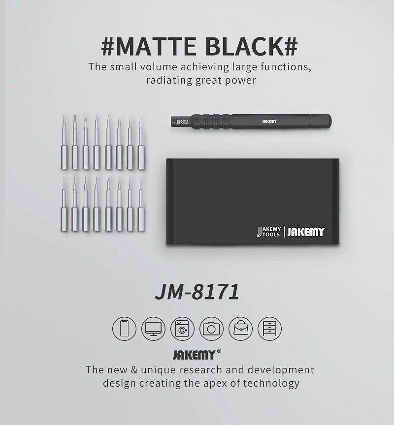 Jakemy JM-8171 — це набір із 16 точних довгих магнітних насадок з легкою алюмінієвою рукояткою, призначених для точного сервісного ремонту телефонів і смартфонів, зокрема Samsung, Huawei, Продукти Xiaomi, Oppo та Apple, тобто iPhone, MacBook Air і Pro.