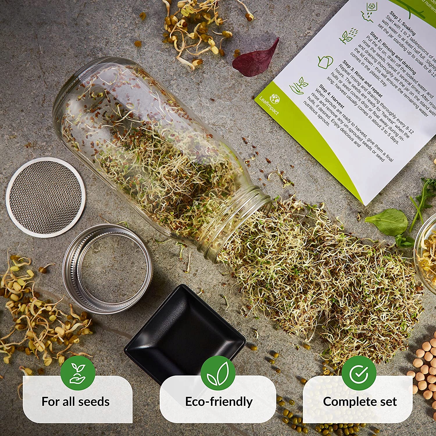 - Повний пристрій для проростання входить: повний комплект з усім необхідним, ідеально підходить для новачків. Набір банок для пророщування включає кришку та підставку з нержавіючої сталі 304, звичайну склянку на 750 мл, лоток та інструкції в коробці. Легкий дренаж, відмінний потік повітря та запобігає випаданню насіння. Легко чистити та можна мити в посудомийній машині.