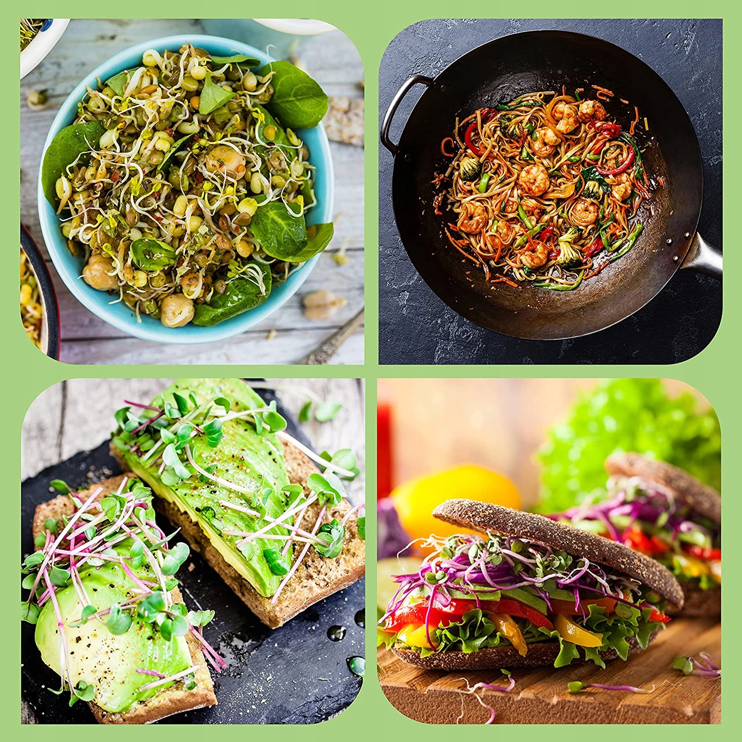 - Вирощуйте всі види насіння, бобів або горіхів: наше скло для проростання розсади можна використовувати як пристрій для проростання різних паростків. Використовуйте набір для вирощування паростків, щоб вирощувати такі насіння, як: крес-салат, люцерна, брокколі, маш, гірчиця, сочевиця, арахіс, кіноа, нут, зелений горошок, трави, квіти тощо. Вашій кішці сподобається щойно вирощений пирій! Насолоджуйтесь свіжими органічними паростками в салатах, бутербродах, смаженій картоплі, обгортаннях і супах.