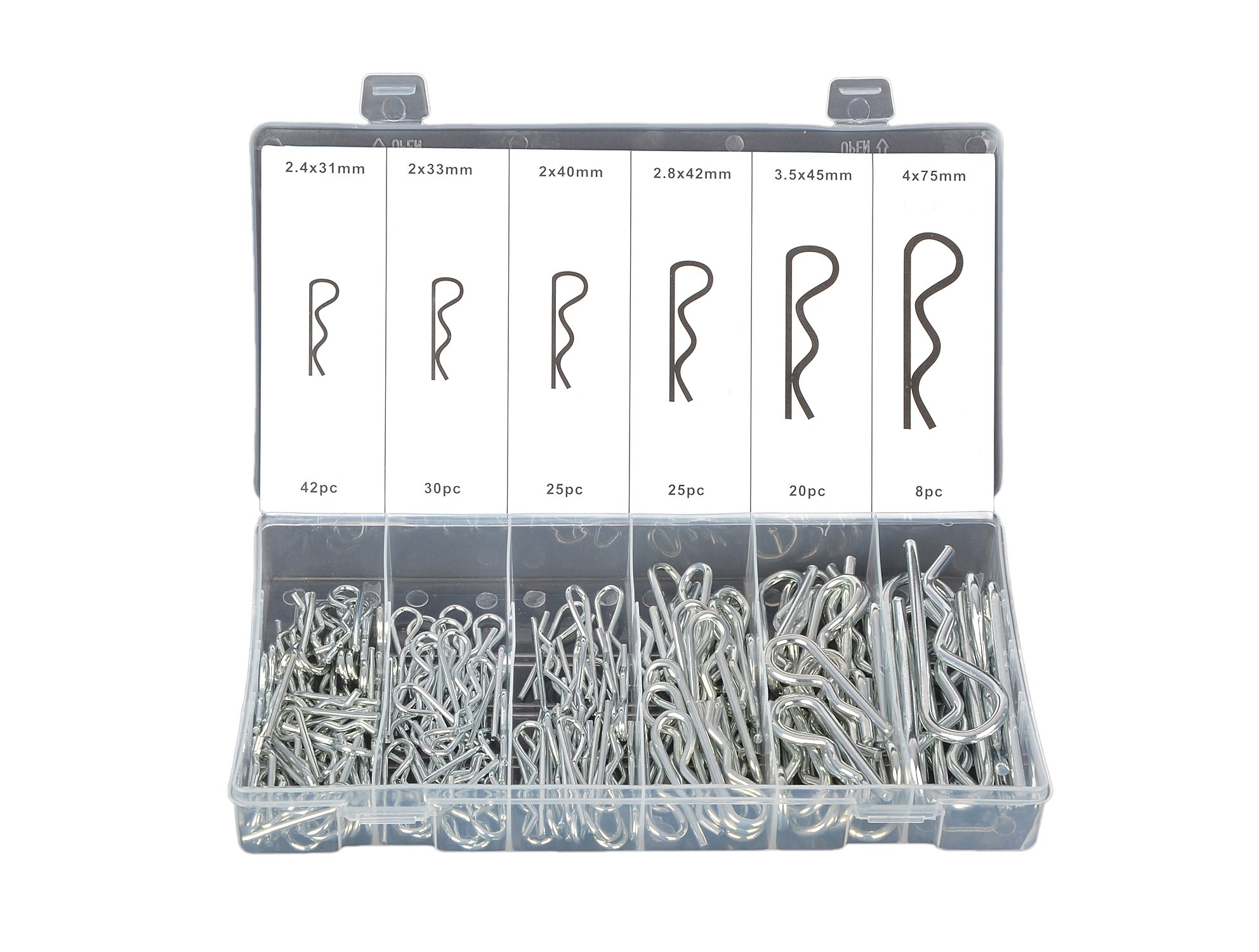 Універсальний набір шплінтів - пружинних шпильок. Корисний як у професійному обслуговуванні, так і в домашньому гаражі.