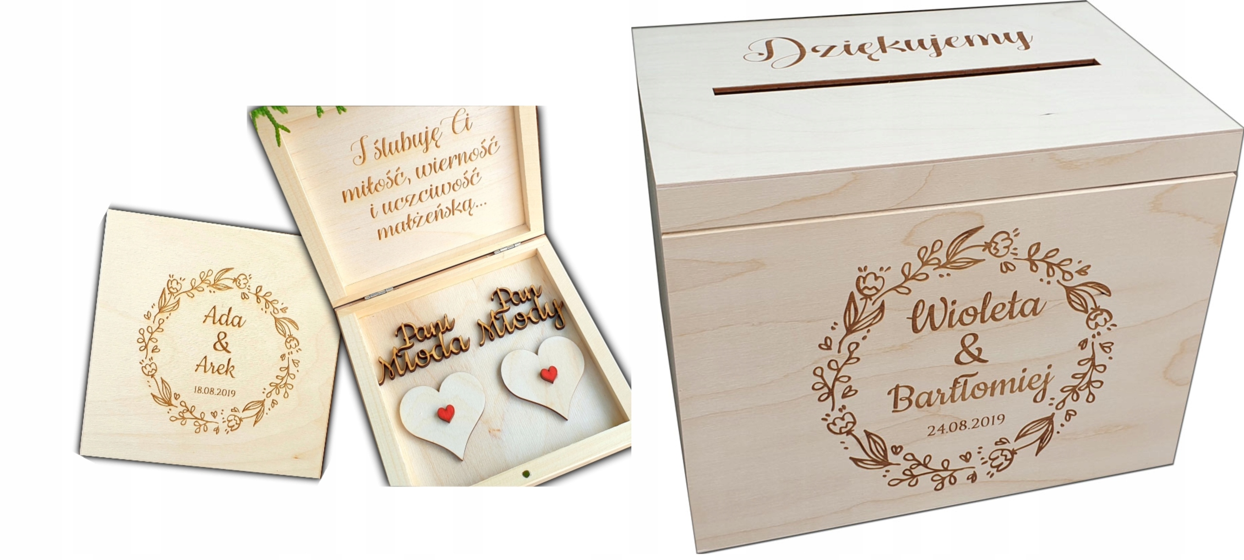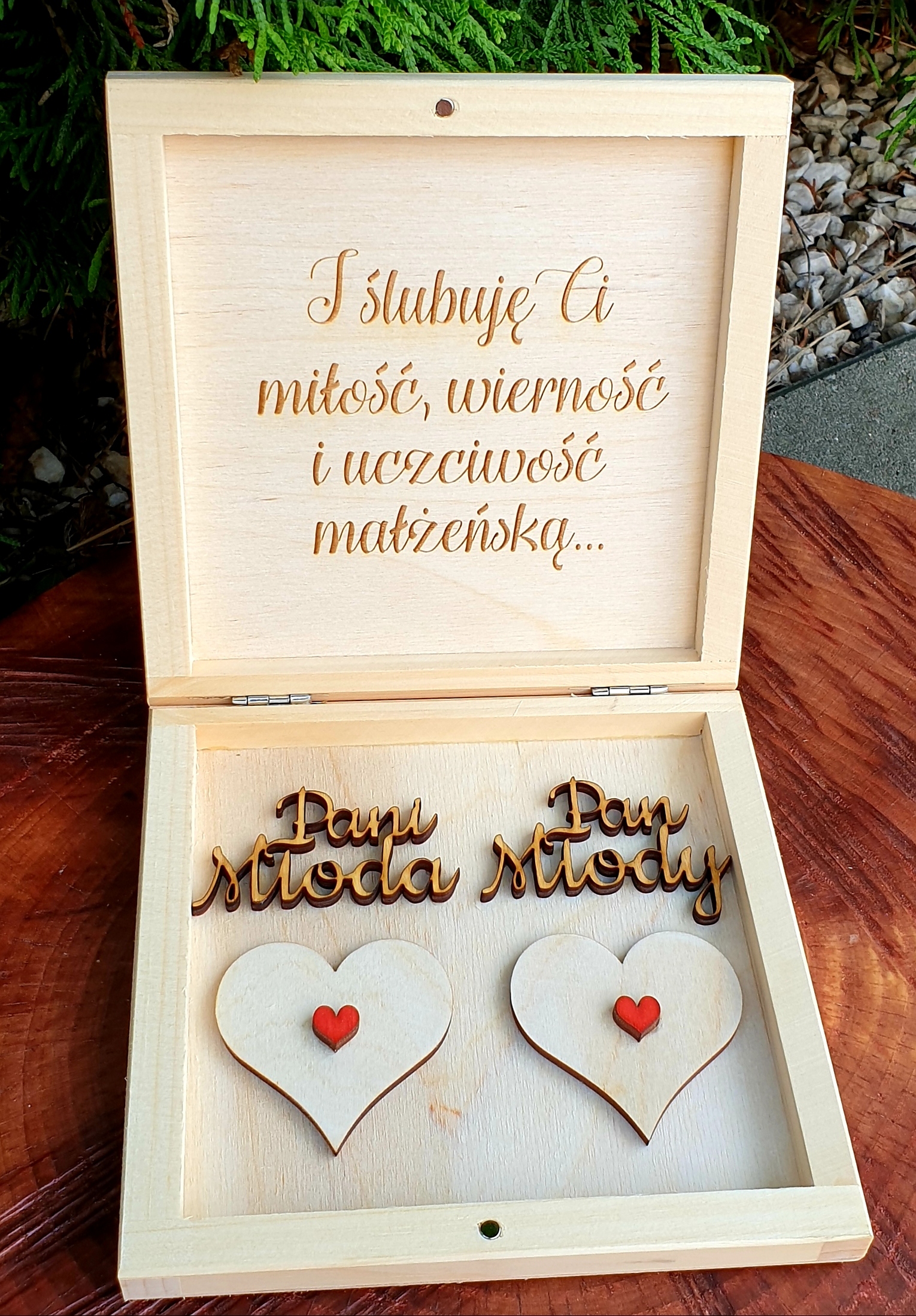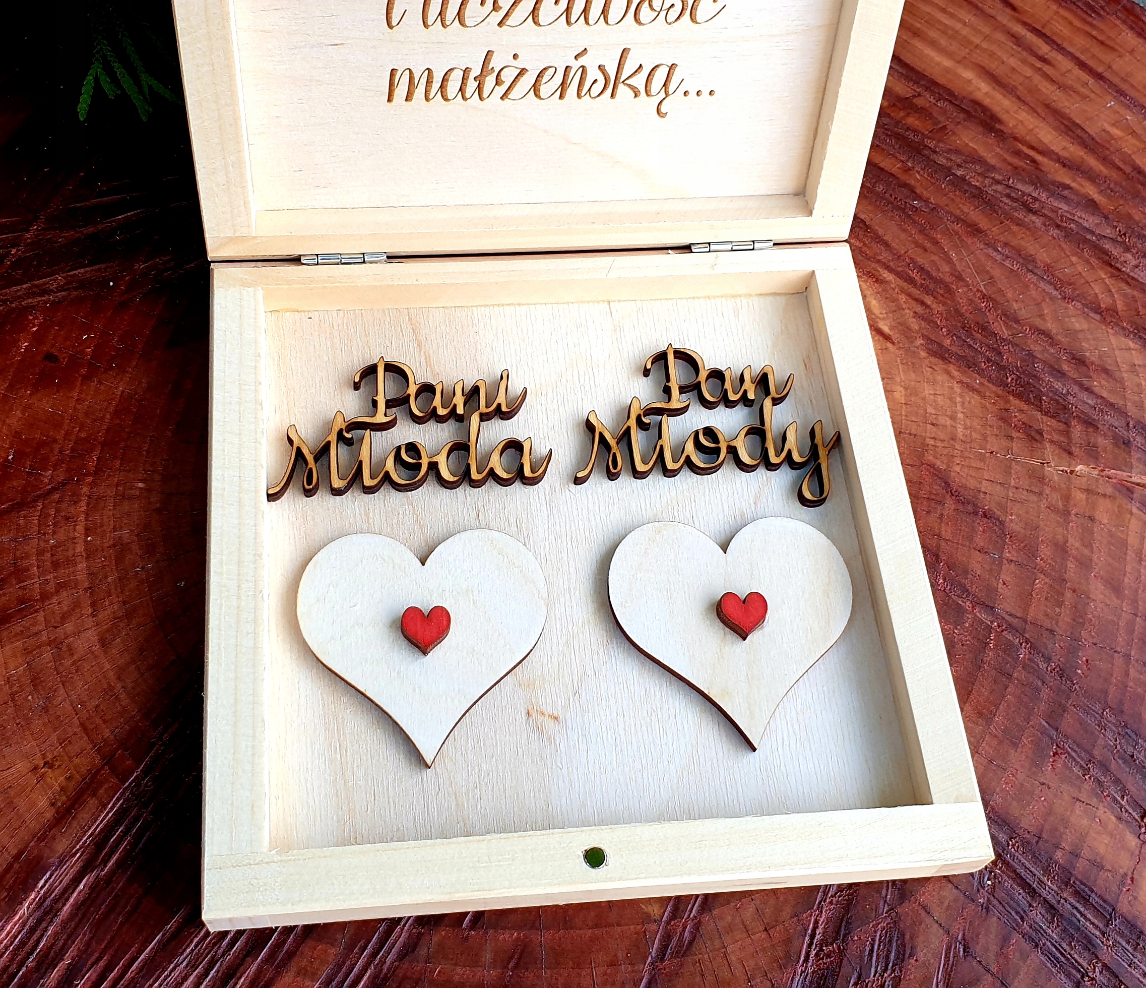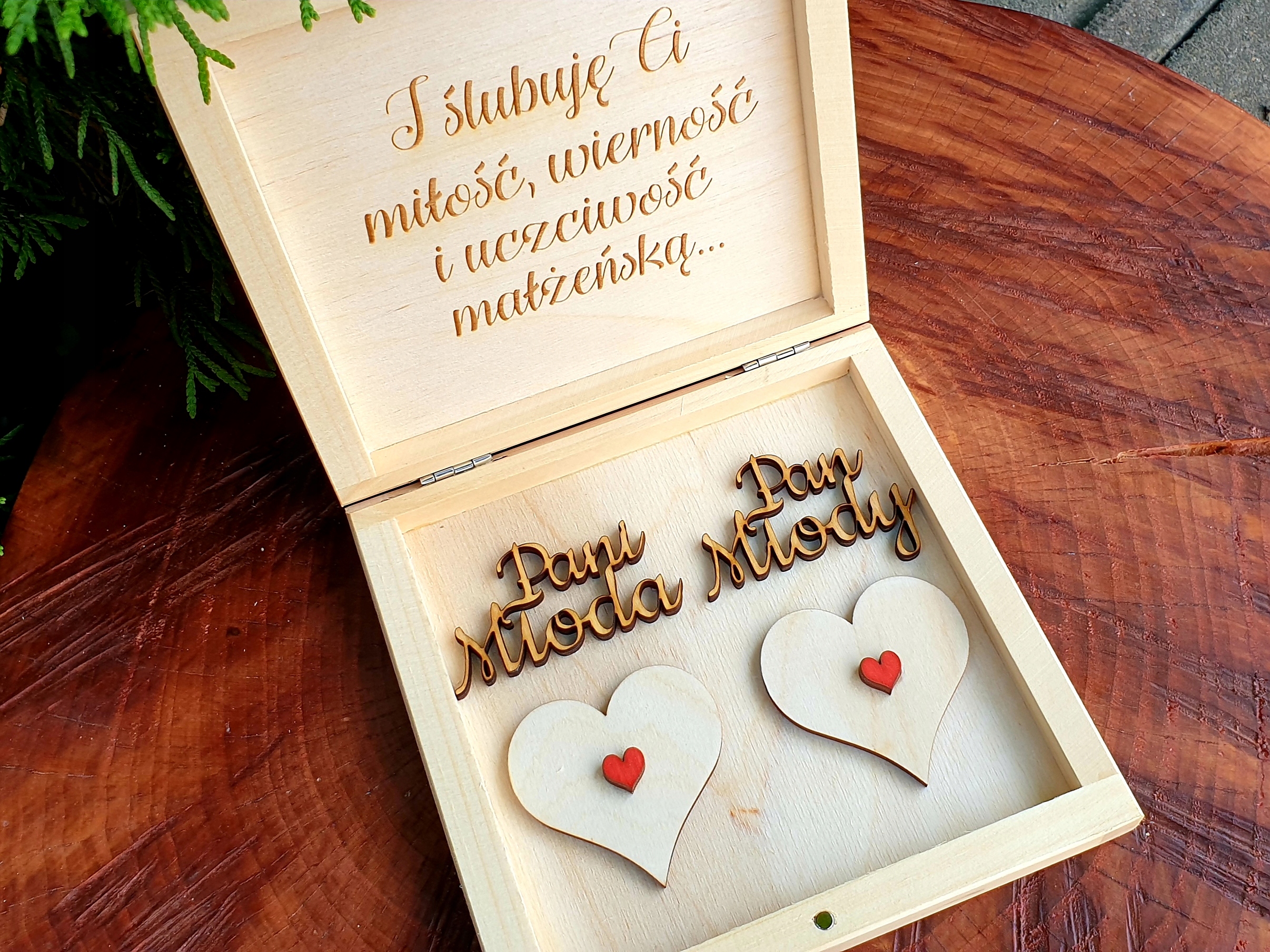- ШКАТУЛКА ДЛЯ ОБВІЧАЛЬНИК натурального кольору з додаванням червоних сердечок та індивідуальним гравіюванням