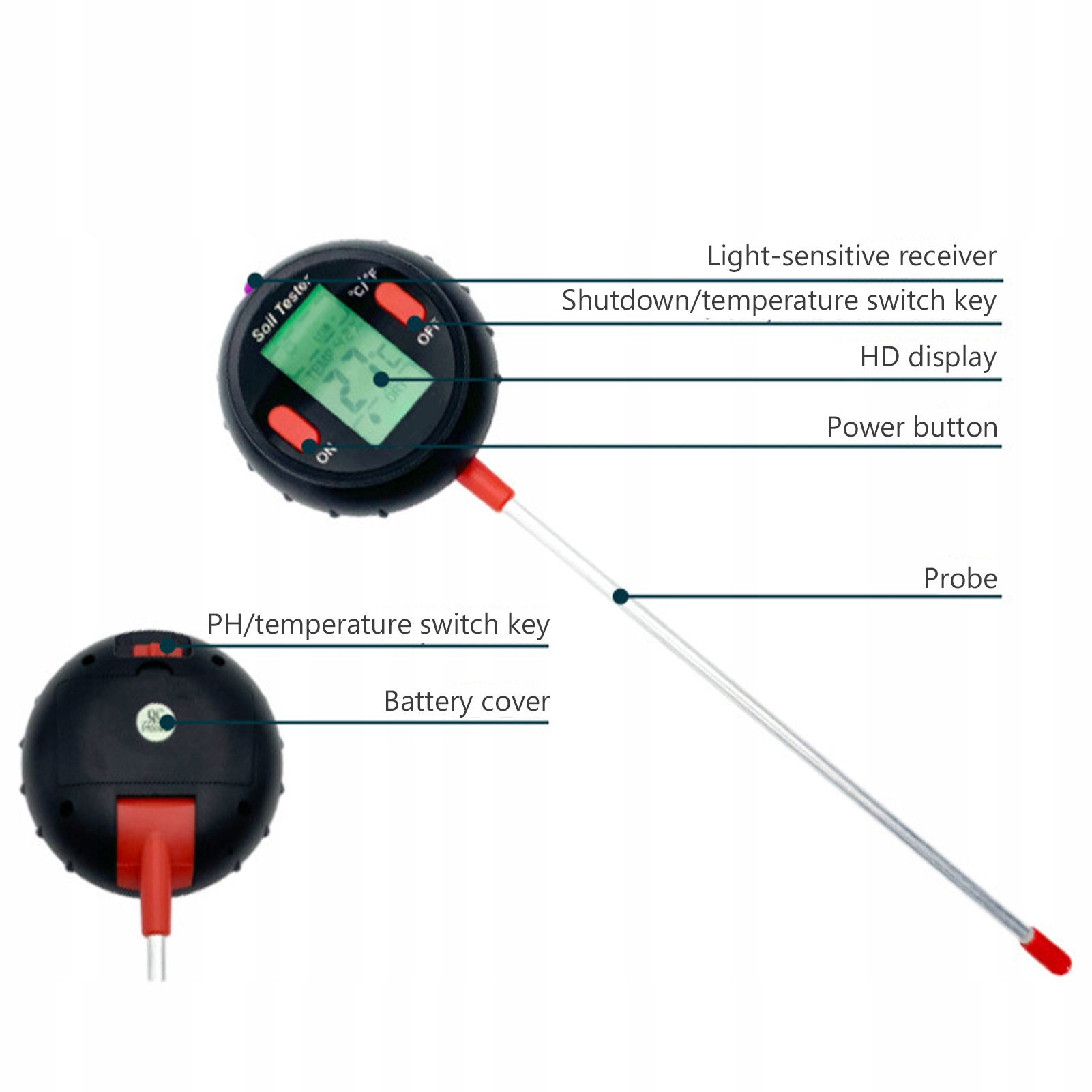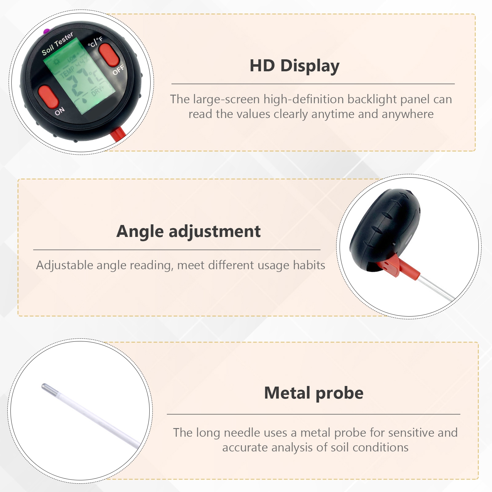 4. Підсвічування великого екрана з високою роздільною здатністю дозволяє чітко читати значення будь-де та всюди. Регульований кут читання, відповідає різним звичкам використання. Довгий зонд використовує металевий зонд для чутливого й точного аналізу стану ґрунту.