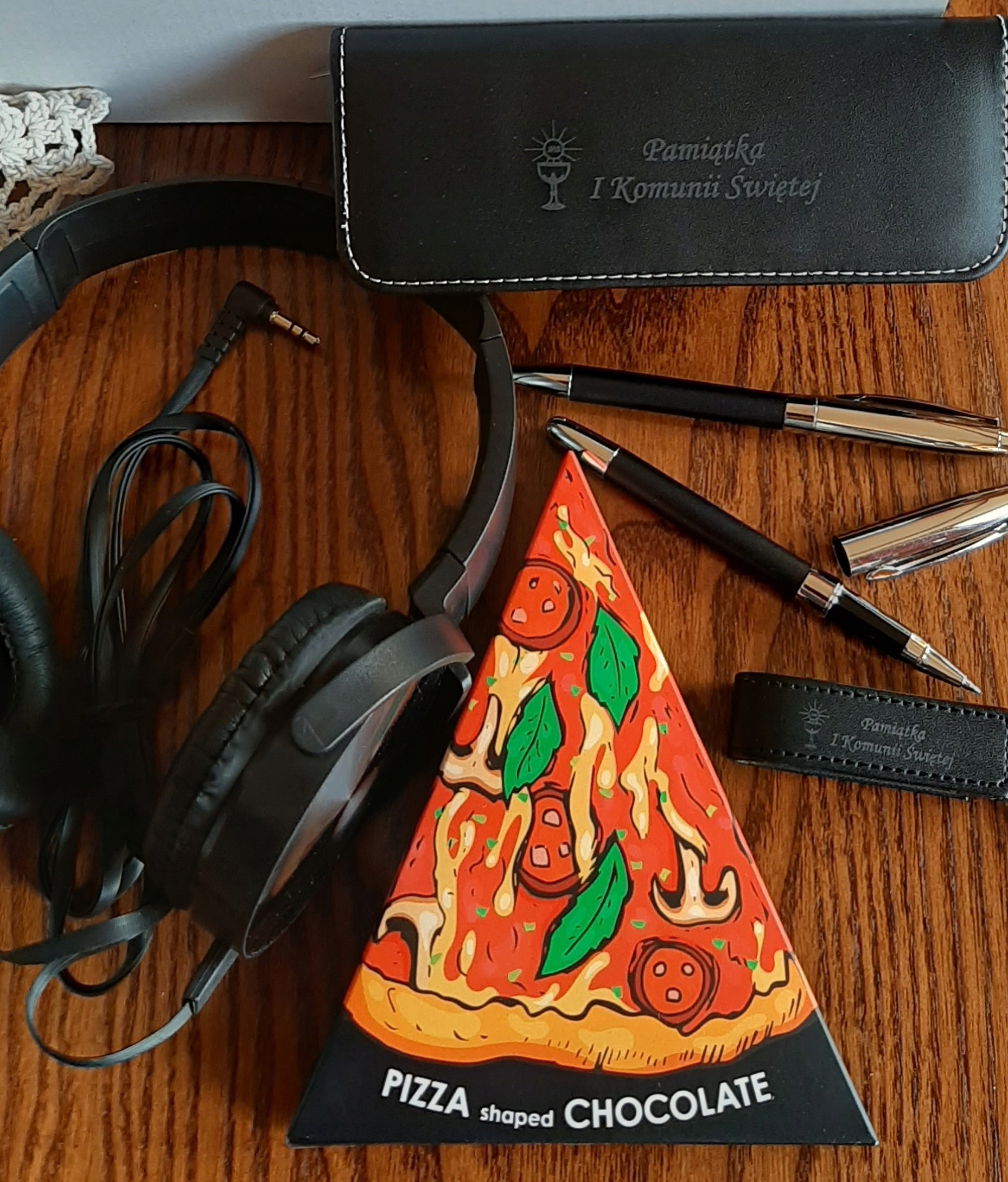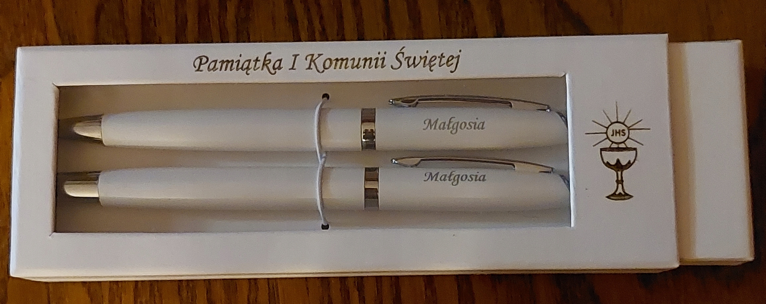 Якщо у вас немає письмового набору з екошкіри, його можна замінити набором у коробці: кулькова ручка та кулькова ручка з гравіюванням імен. Скринька має особливі прикраси: Сувенір Першого Святого Причастя.