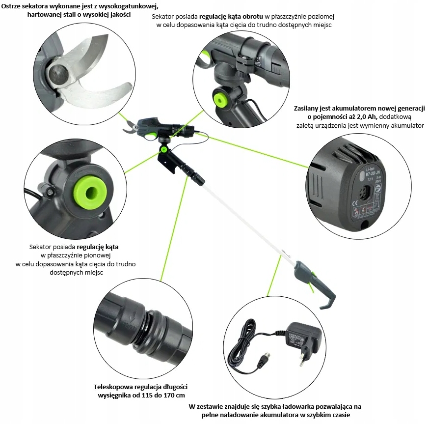 Легкий телескопічний секатор, призначений для догляду та обрізки дерев, живоплотів, кущів, декоративних рослин і винограду. Забезпечує повну мобільність. Це дозволяє вам працювати там, де ми не маємо доступу до електроенергії, забезпечуючи тиху роботу без кабелю та без викидів вихлопних газів.