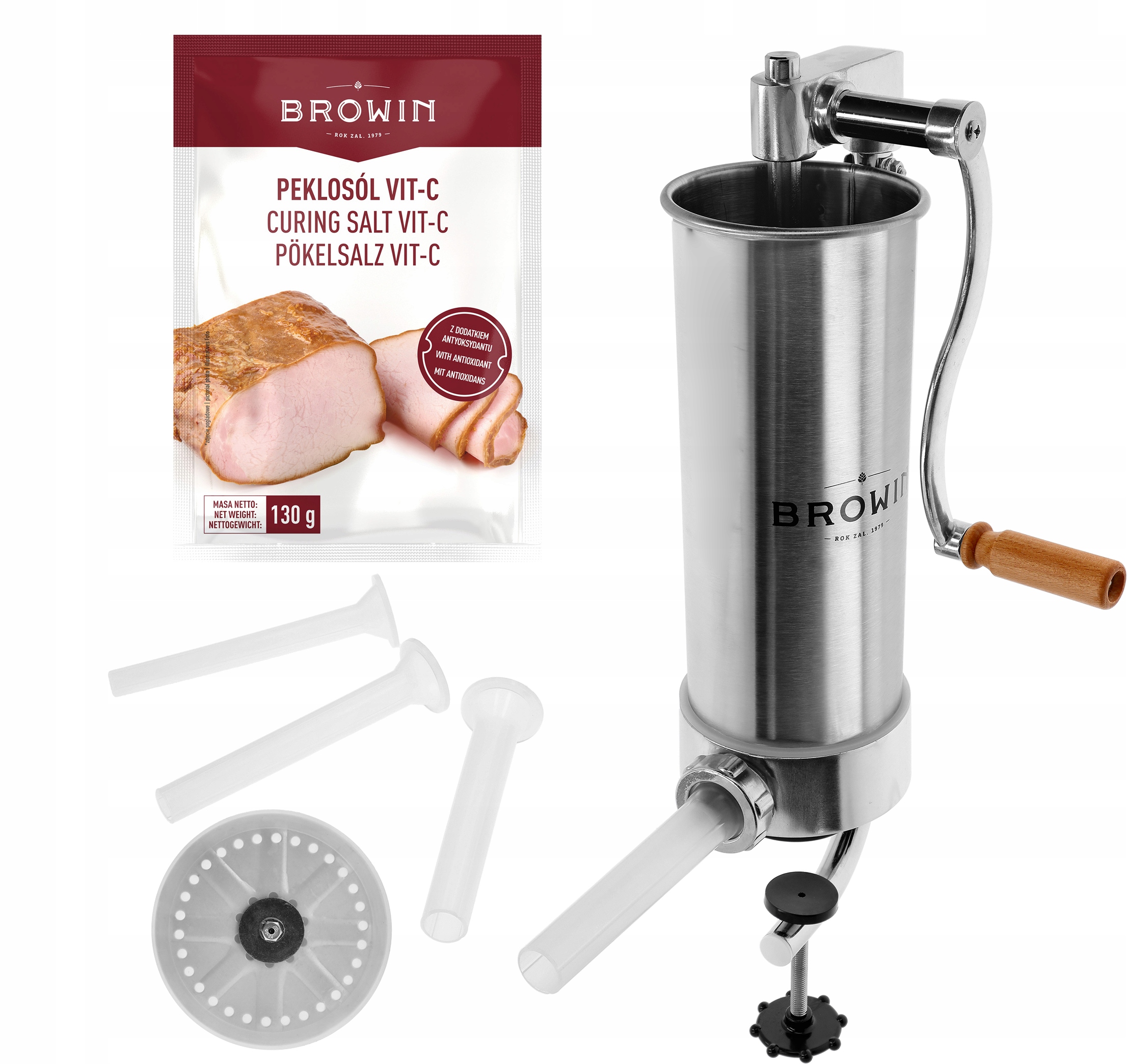 Вертикальний, виготовлений ручний ковбасний начинка з Browin -чудовий продукт як для домогосподарств, так і для невеликих м'ясних магазинів. Завдяки цьому ми можемо легко підготувати різні типи ковбас, наповнюючи кожухи начинкою м'яса. Набір із начистом включає 3 послідовності з різними діаметром.