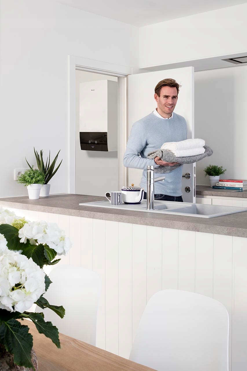 Сучасний настінний тепловий насос повітря-вода, призначений виключно для опалення приміщень. Пристрій характеризується компактними розмірами, що дозволяє встановлювати навіть в обмеженому просторі, без необхідності дотримання великих бічних відстаней. Елегантний дизайн дозволяє гармонійно поєднуватися з іншими побутовими приладами. Завдяки вбудованим гідравлічним компонентам немає необхідності використовувати додаткові компоненти від інших постачальників. Тепловий насос можна комбінувати з резервуаром з нержавіючої сталі або тепловим накопичувачем ECH₂O, що підвищує його універсальність. Налаштування пристрою просте та інтуїтивно зрозуміле завдяки майстру з кольоровим інтерфейсом високої роздільної здатності, який дозволяє налаштувати його лише за 9 кроків.