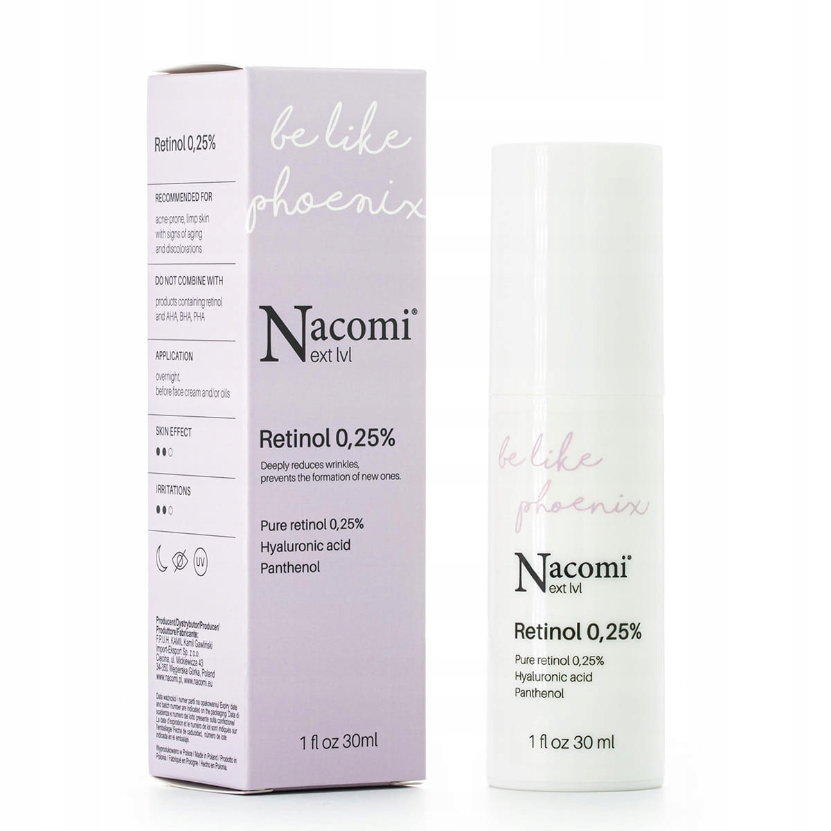 Висококласна нічна сироватка з чистим ретинолом (0,25%) зменшує зморшки, покращує натяг і еластичність шкіри та освітлює плями. Ретинол має не тільки властивості проти зморшок, але й проти прищів.