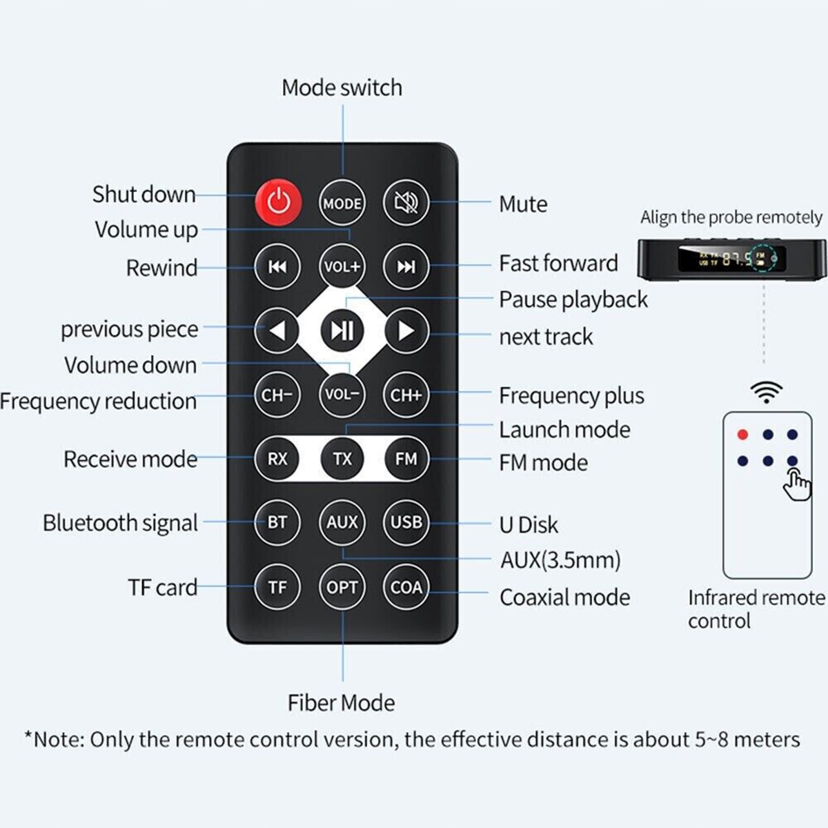 Пульт дистанційного керування 5~10 м:Високочутливий інфрачервоний пульт дистанційного керування, безпроблемний і трудомісткий, чіткі функції, керування однією кнопкою.