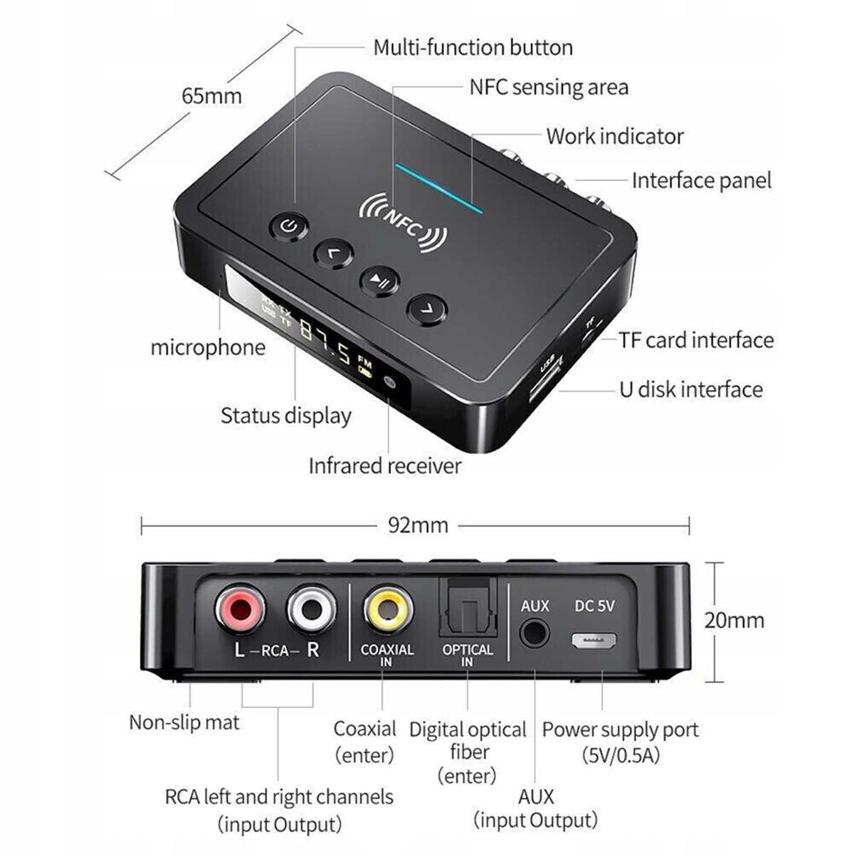 Багаті цифрові/аналогові інтерфейси: Завдяки AUX/RCA/оптичним/коаксіальним інтерфейсам, він може підтримувати всі типи аудіопристроїв, plug-and-play.