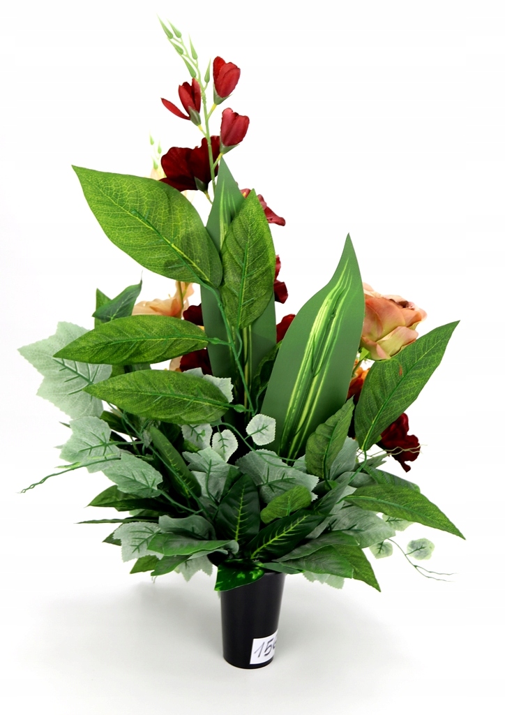 - використано штучні квіти: довгі суцвіття атласних гладіолусів двох відтінків, великі щільні хризантеми, великі атласні троянди з трохи відкритим і закритим бутоном, менші троянди з закритим бутоном, середні відкриті лілії, великі квіти анемони бордового кольору, стебла з крихітними біло-зеленими квітками та листям,
