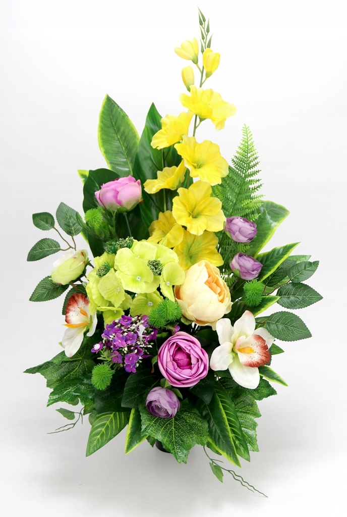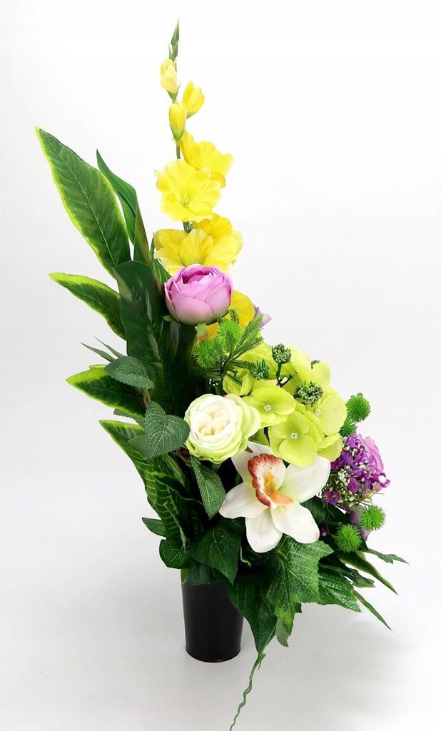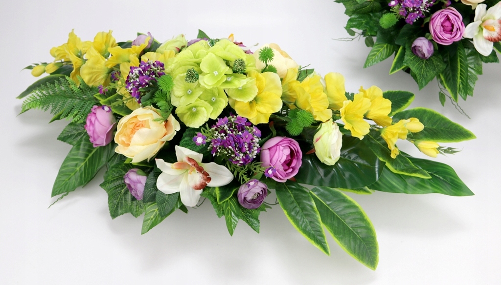 - використано штучні квіти: гладіолуси атласні сонячно-жовтого кольору відтінок, великі гортензії світло-зеленого кольору, міні-гортензії фіолетового кольору, великі атласні півонії в відтінку кремового кольору, щільні атласні квіти, більші та менші в еп. фіолетові, середні піоноподібні троянди світло-кремового кольору із зеленим, поодинокі квіти орхідеї брудно-білого з бордовим,