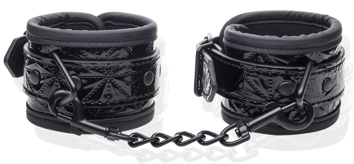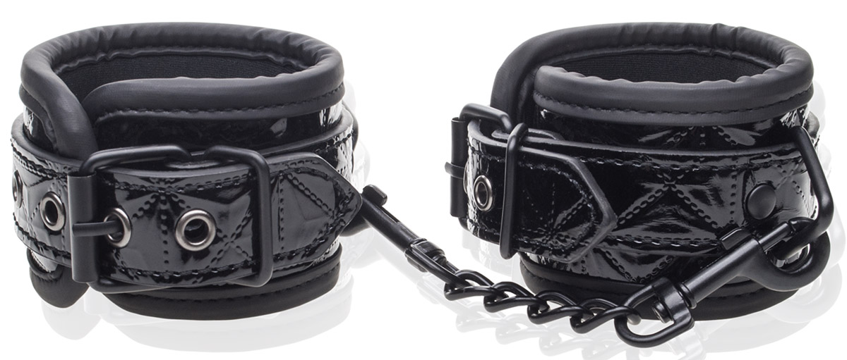 Надійно виготовлені наручники з широким діапазоном регулювання на ременях. Зовні гарно оброблений блискучим пластиком. Зсередини вони покриті ніжним матеріалом, тому не викликають потертостей і не подразнюють шкіру. Наручники з'єднані сталевим ланцюгом з карабінами, завдяки чому можна прив'язати іншу людину до нерухомих елементів. Дуже елегантний гаджет для пустотливих розваг.