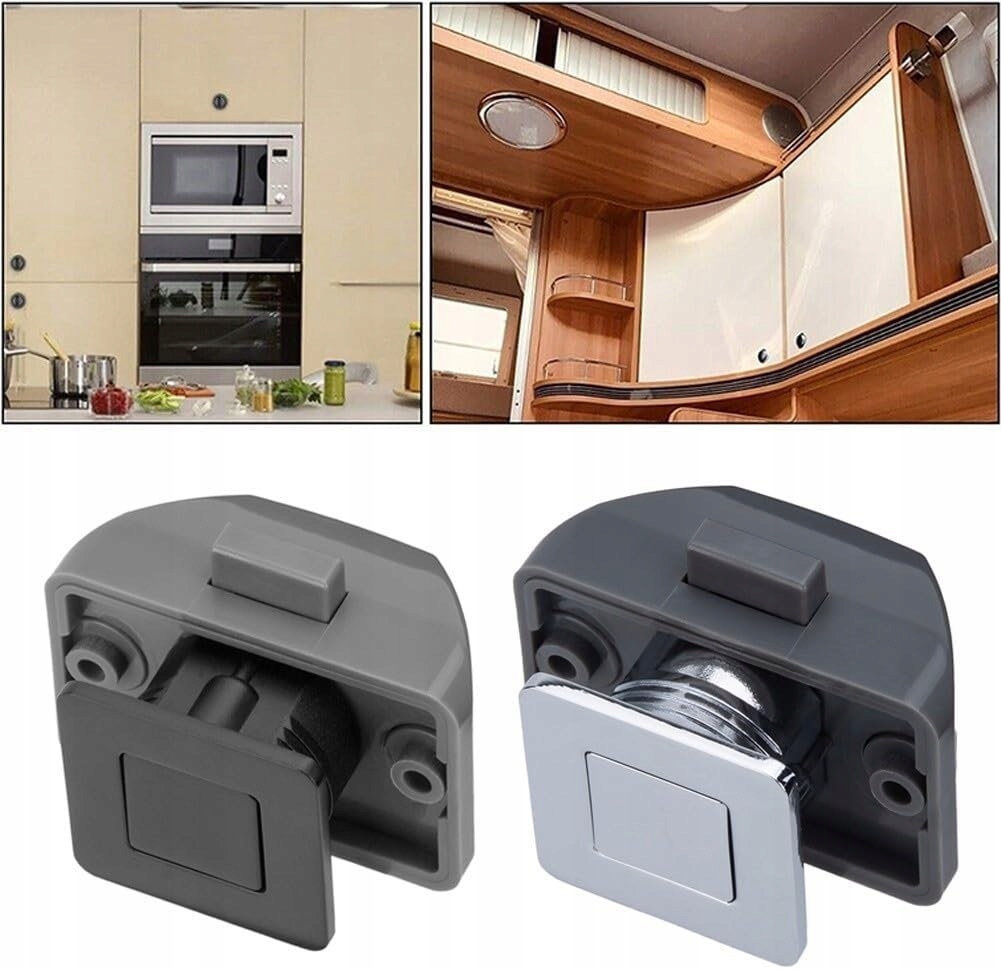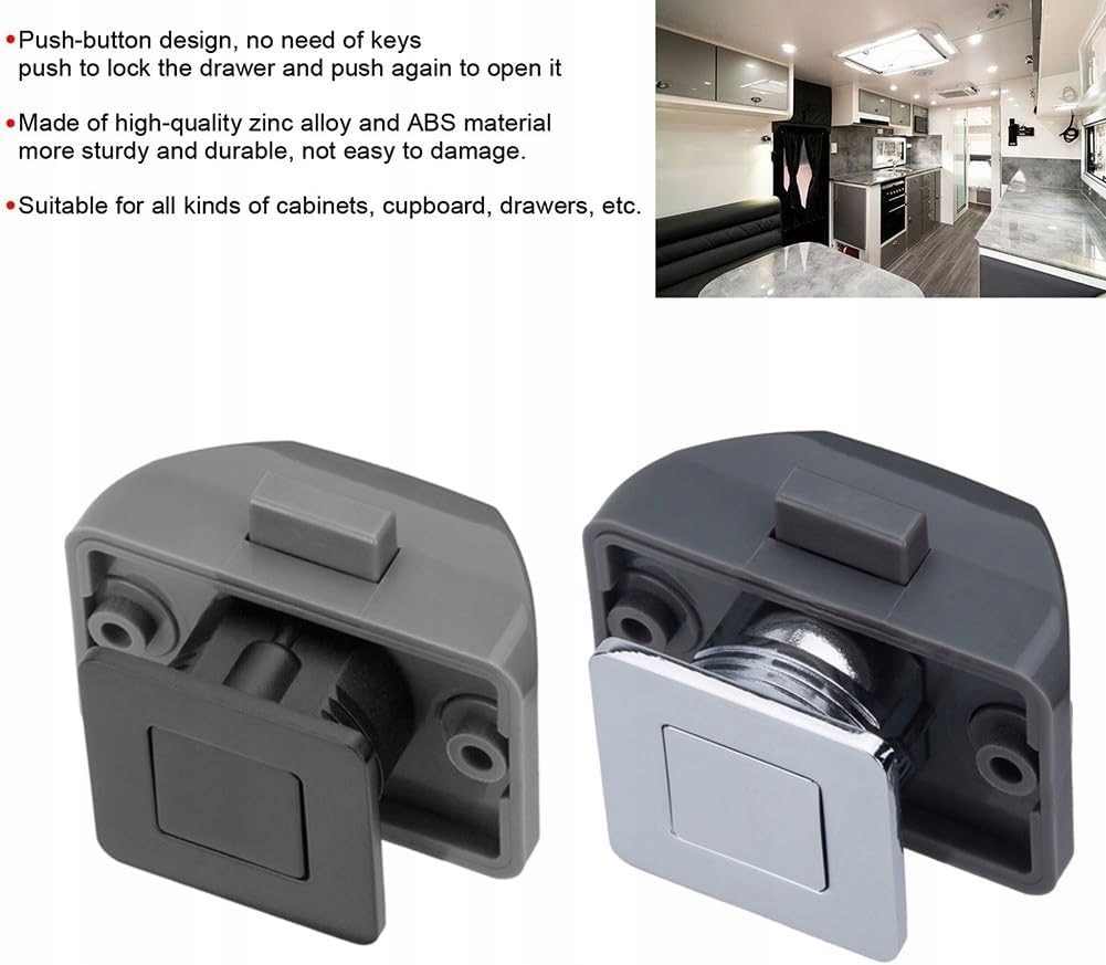 Стійкий і практичний. Виготовлений із високоякісного цинкового сплаву, цей замок із застібкою є міцним і практичним у використанні. Тип ручки-кнопки Цей замок — новий тип із ручкою-кнопкою, спеціально розроблений для яхт і кемперів. Подвійна функція. Замок не тільки виконує функцію блокування, але й служить ручкою для легкого доступу. Гарний зовнішній вигляд Підходить для всіх типів меблів, має гарний і елегантний зовнішній вигляд. Легкий монтаж завдяки простому монтажу та зручному використанню ефективно запобігає відкриванню дверцят меблевих шаф під час руху.