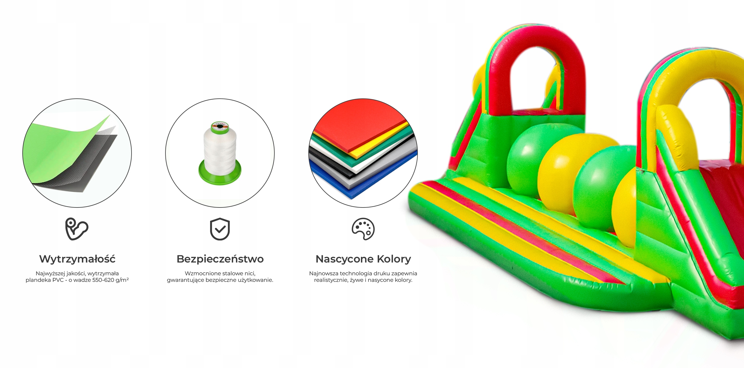 - Якість виготовлення відповідає європейським стандартам PN-EN 14960. Надувна гірка стійка до погодних умов, швидко висихає та має високу якість. матеріали гарантують довговічність.
