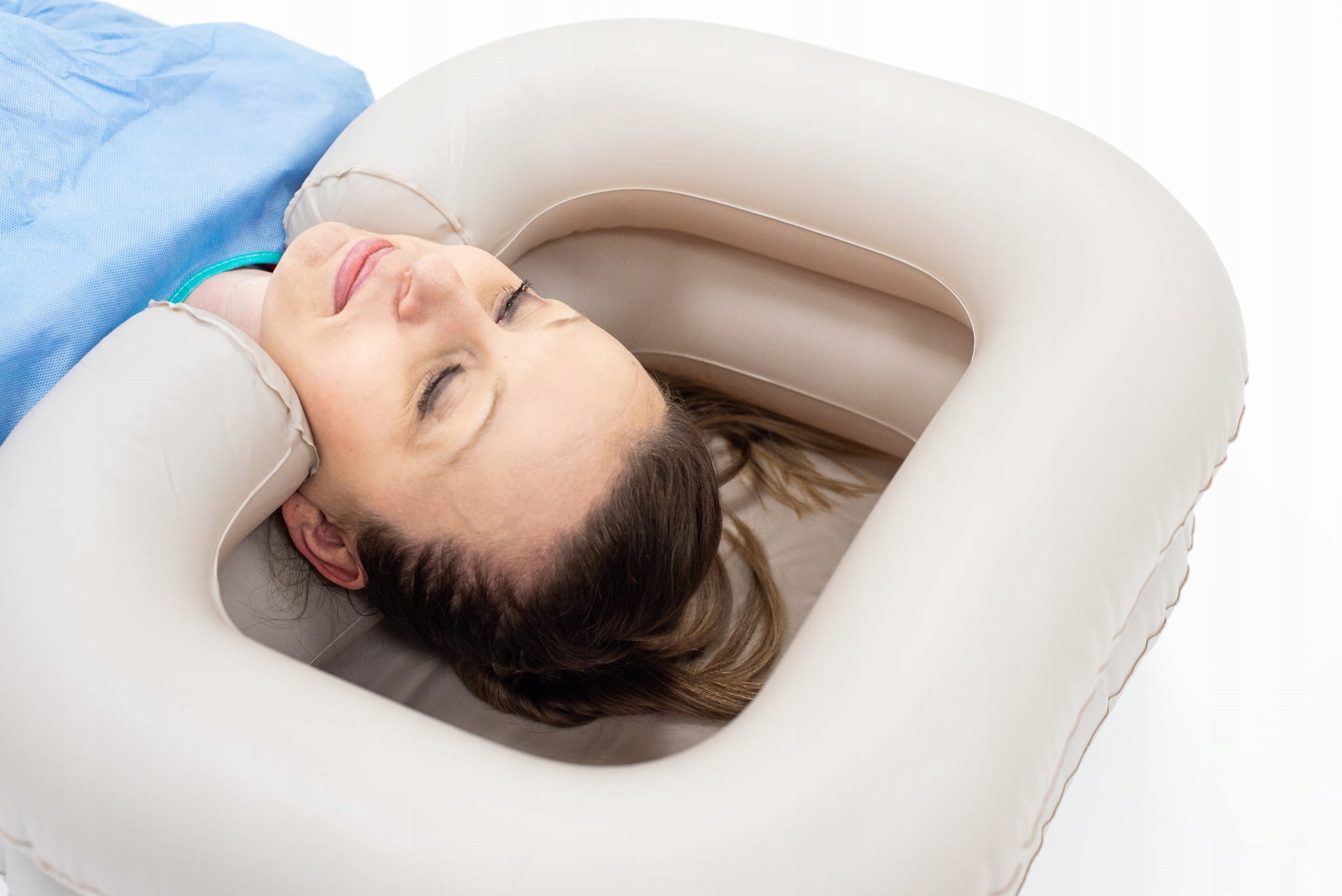 Надувний басейн призначений для миття голови, наприклад в ліжку. Просто покладіть миску під голову. Для зручності використання він має дві повітряні камери, кожна зі своїм отвором для надування. Можна надувати через рот або за допомогою насоса.