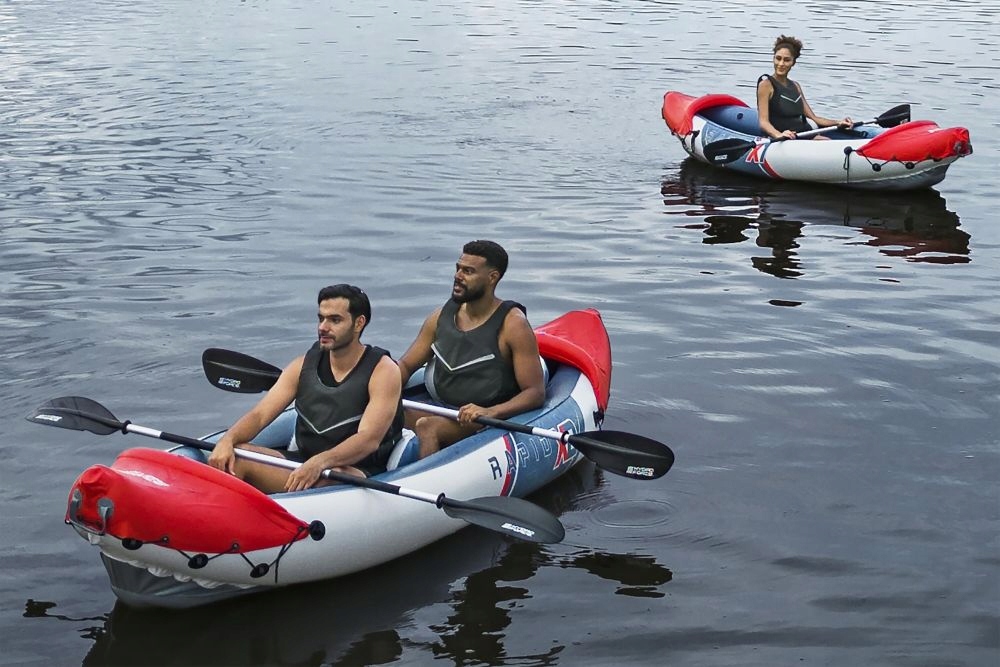 Bestway Rapid X1 65176 оснащений двома міцними алюмінієвими веслами , які забезпечують легке маневрування на воді. Алюмінієва конструкція зору гарантує їх легкість та довговічність, що означає комфорт використання. Крім того, набір включає вручну насос , що дозволяє швидке і неприємне накачування байдарки , готуючи його до використання за короткий час. Варто також згадати транспортний пакет , який включений у набір, а це означає, що переміщення байдарки ще зручніше.