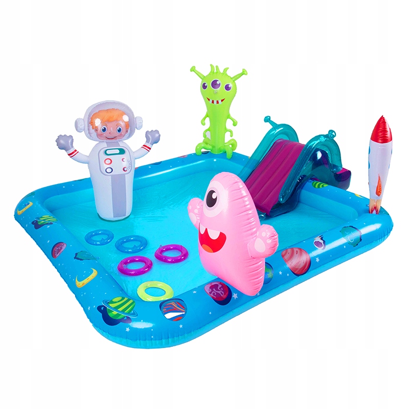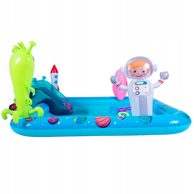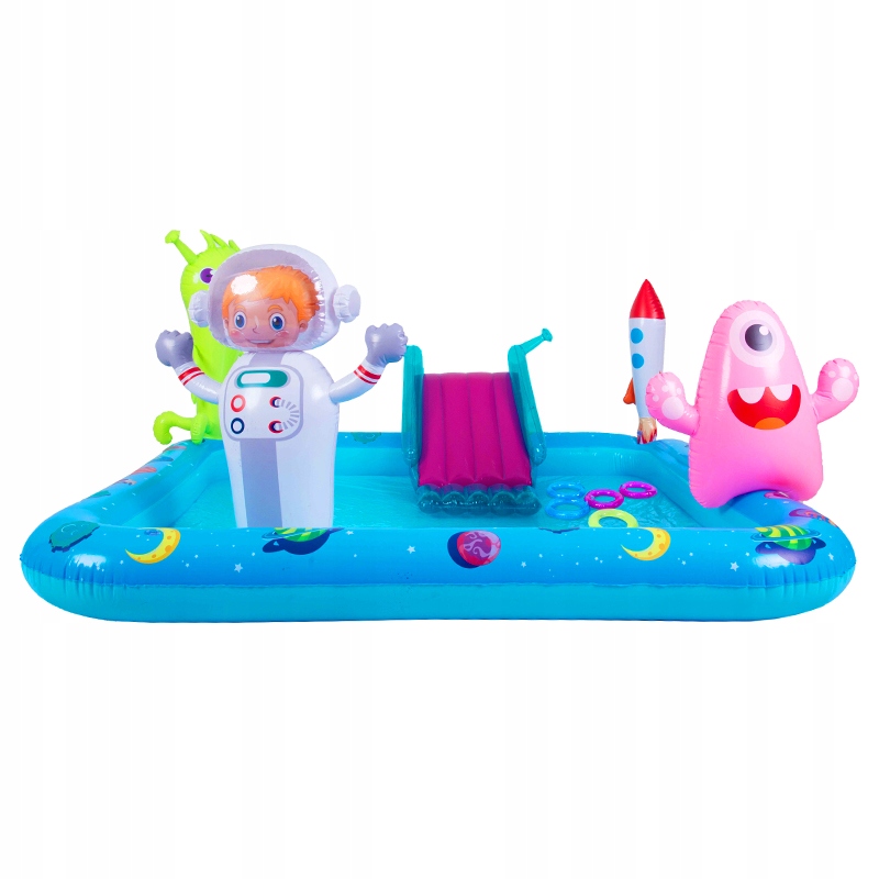 Надувний басейн SPACE - це універсальний водний набір, призначений для найменших користувачів, який ідеально підійде як атракціон в саду, на ділянці або на терасі. Виріб поєднує в собі функції неглибокого басейну, гірки та набору різнокольорових іграшок, створюючи інтерактивний простір для розваг і відпочинку.