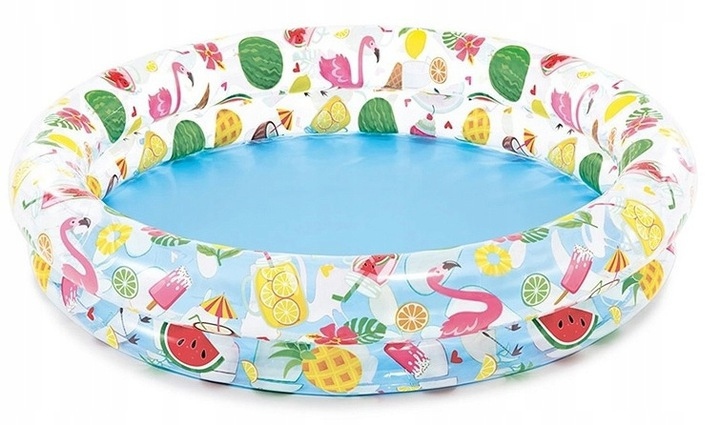 Басейн має літній барвистий малюнок з морозивом, фруктами та фламінго.