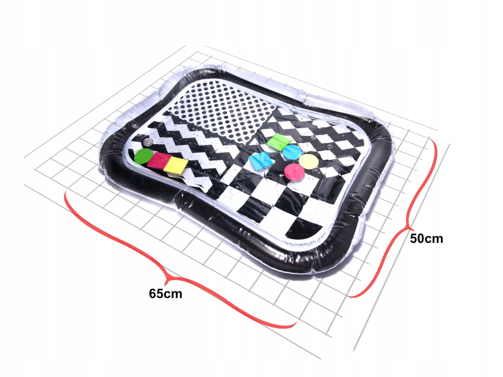Чудовий сенсорний килимок для немовлят з чорно -білим контрастним малюнком. Всередині килимок є барвисті геометричні фігури, які рухаються під час руху дитини. Ваша дитина, лежачи на животі, здійснює м’язи, відповідальні за правильну поставу. Його використання дуже просто.