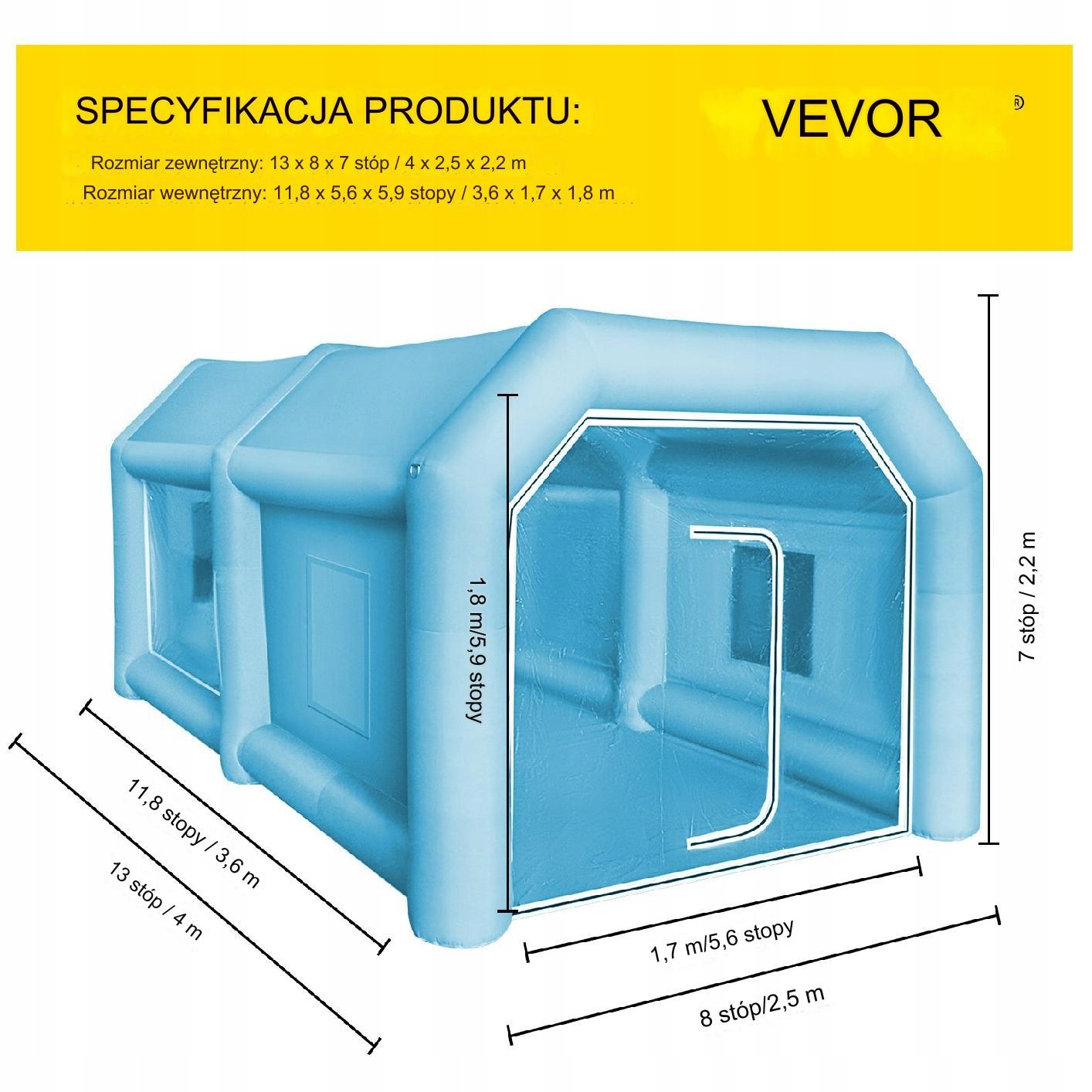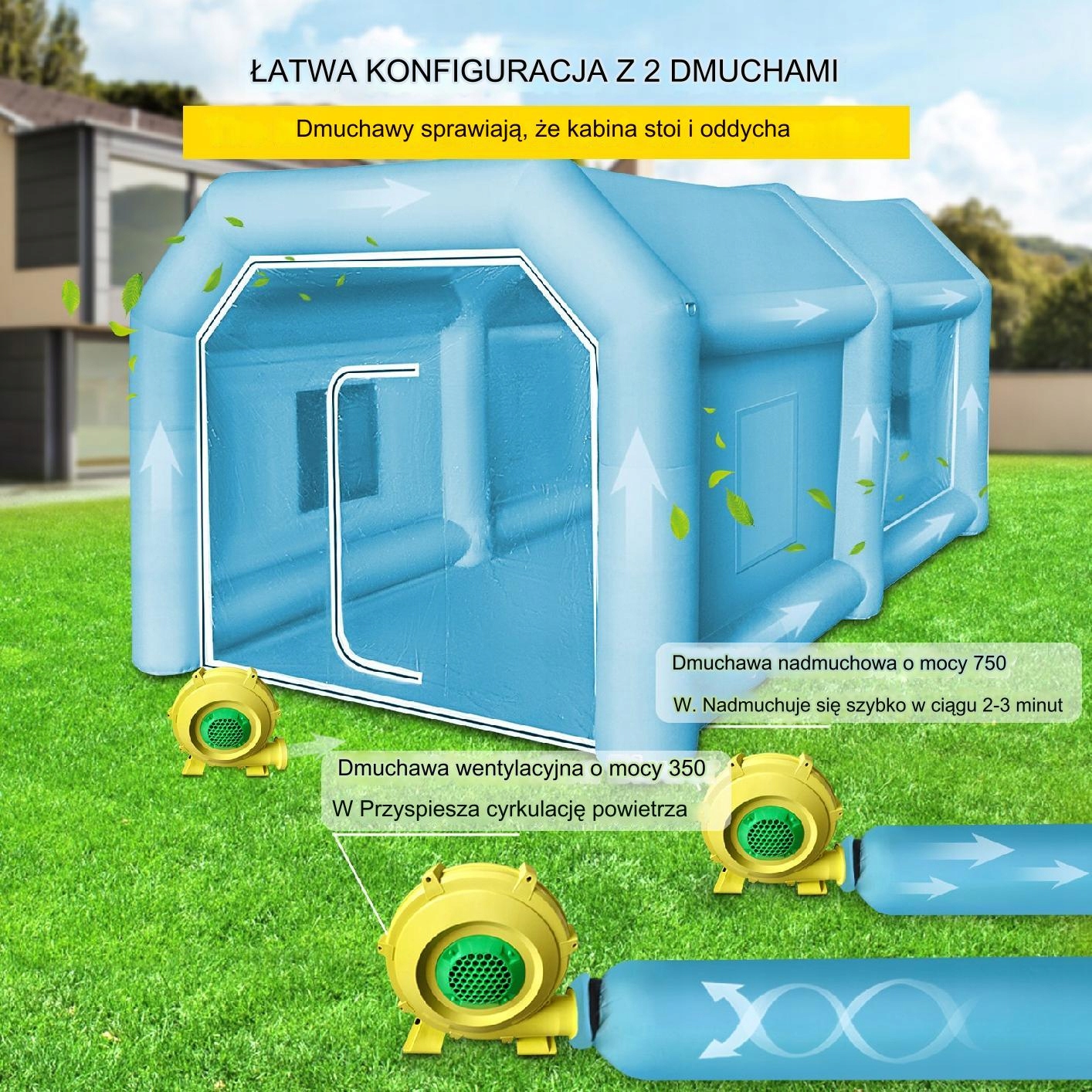 Кабіна для фарбування повністю укомплектована двома повітродувками (750 Вт для надування та 350 Вт для вентиляції), що забезпечує оптимальні умови роботи. Набір також включає сумку для зберігання, чотири мотузки, кілочки, мішки з піском і набір ремонтних латок, що робить його надзвичайно функціональним і простим у використанні для професіоналів із різних галузей.