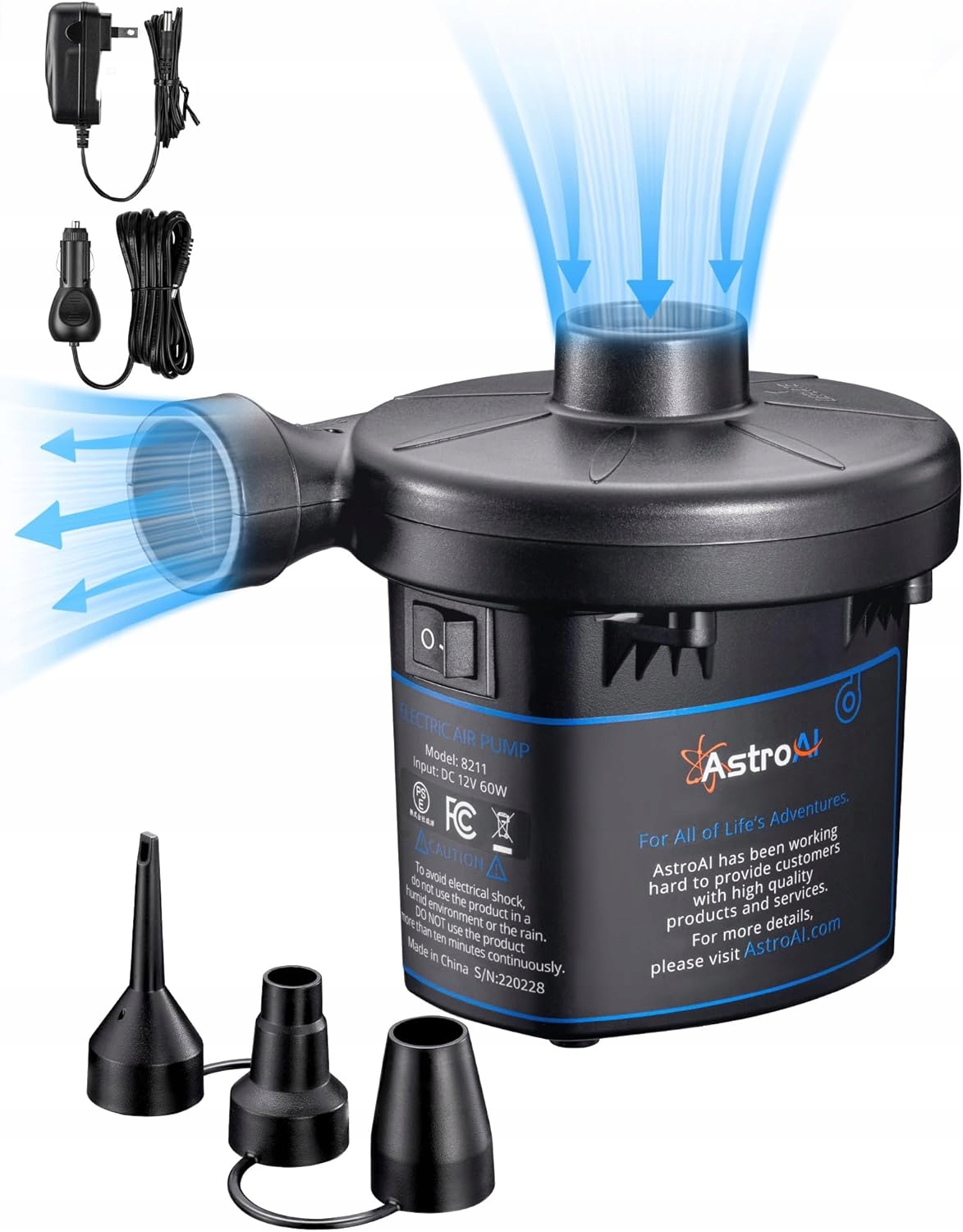 Дуже довгий кабель подачі трьох знімних форсунок: 118-дюймовий шнур постійного струму. Винятково тривалий шнур живлення забезпечує більш гнучку операцію, незалежно від того, використовується він у автомобілі чи в приміщенні. Три типи практичних форсунок ідеально відповідають більшості надувних предметів, а матеріал, стійкий до зносу, значно покращує термін експлуатації форсунок.