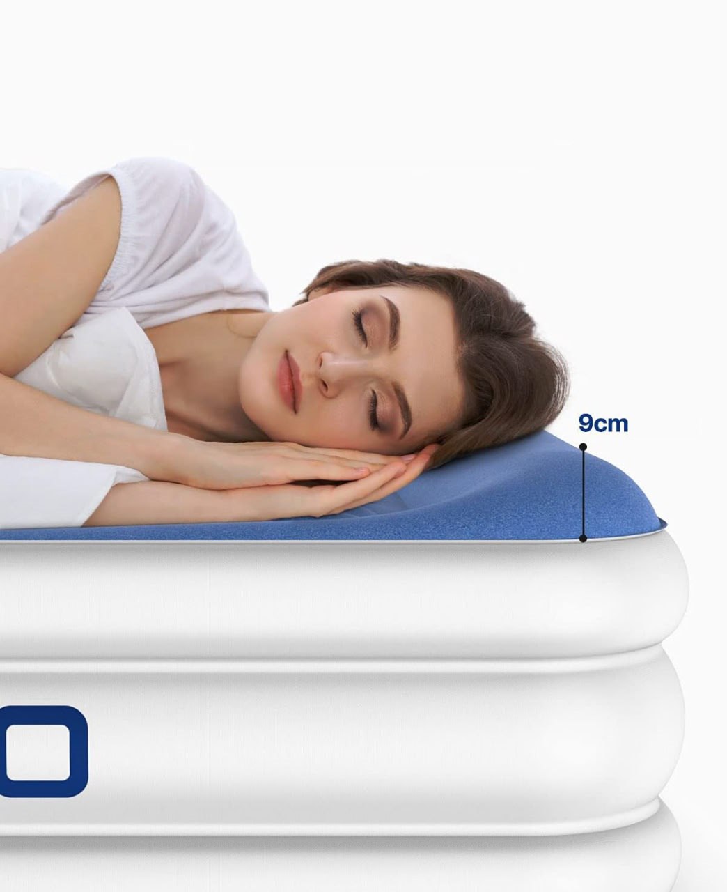 - Інтегрована конструкція подушки: надувний матрац Idoo з подушкою, піднятим 9 см, піднятим за допомогою опори голови та шиї та додаткову підтримку хребта. Якщо ви віддаєте перевагу власній подушці, висота вбудованої подушки вас не турбує.