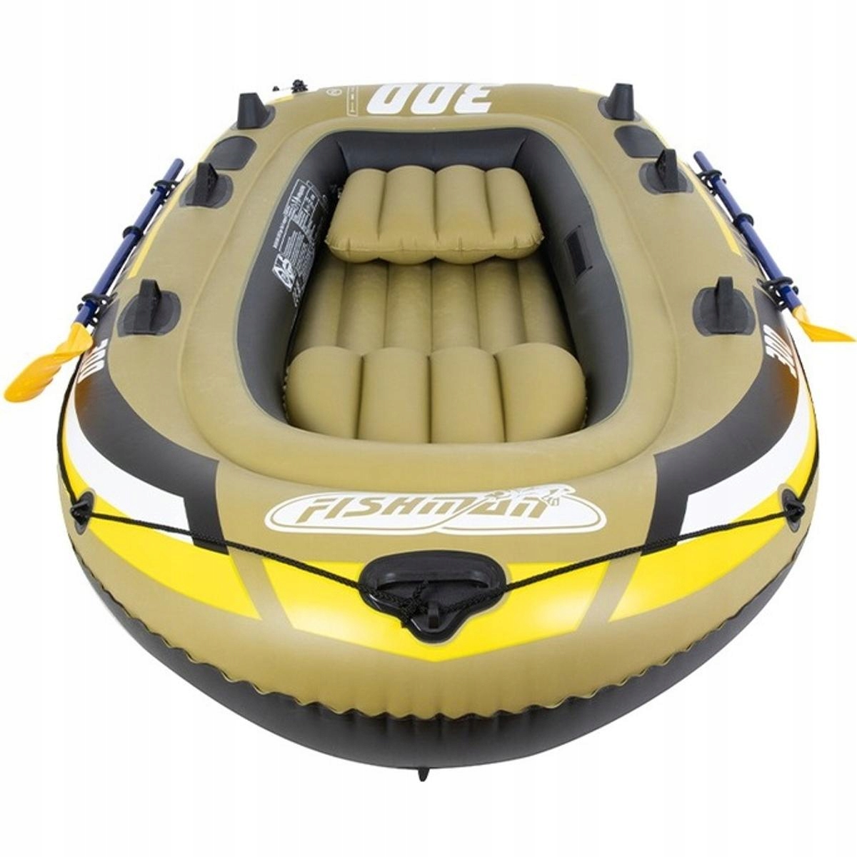 3 - Система удару камери допоможе вам безпечно дістатися до берега у разі перерви одного шару, а спеціальна передня ручка сприятиме її, можливо, буксируванню. Перевага понтону - це м'яка надувна підлога та багато зручностей у вигляді ручок із замком для весла, ручкою стрижня, буксируванням та мішками для дрібних предметів. У наборі ви також знайдете ремонтний пластир, надувний насос, буксирування та два весла. Особливості продукту: