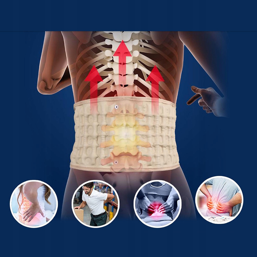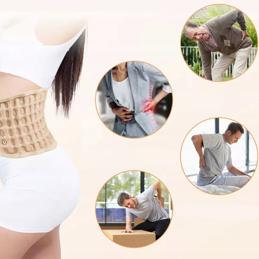 Поперековий пояс має багато повітряних стовпців. Після завищення він забезпечує 360-градусну підтримку нижньої талії. Він ефективно знімає біль у спині, викликані грижею на диску, розтягуючи поперекові м’язи сегмента, тиск поперекового нерва та інші недуги.