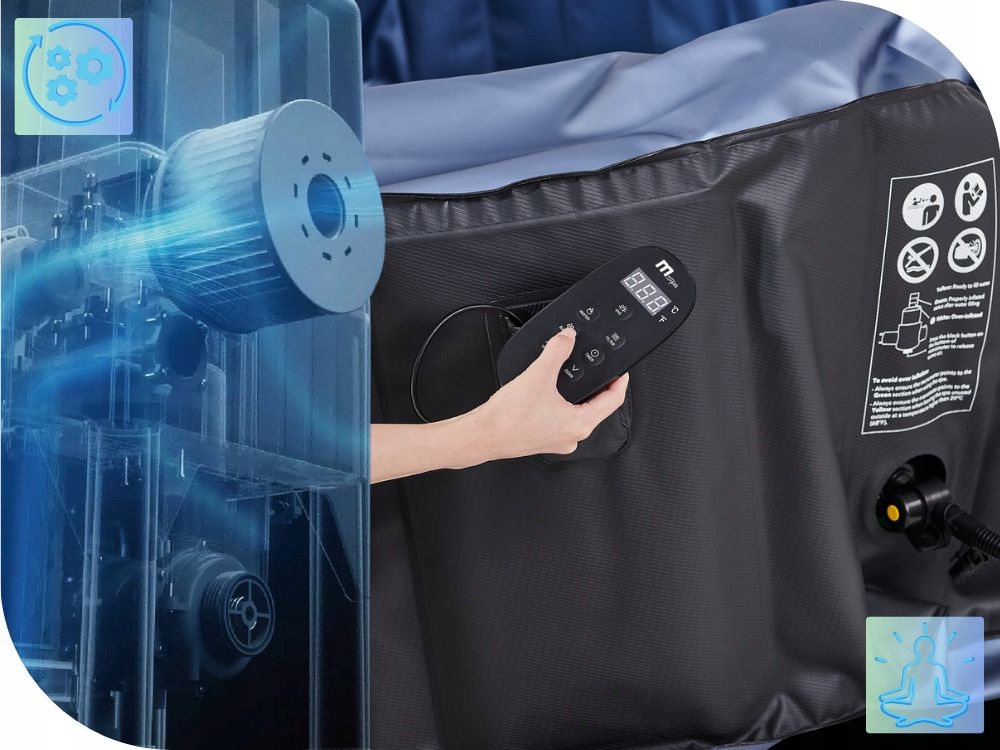 Система MDC MSPA - це найсучасніша система фільтрації. Завдяки новому постійному насоса з інноваційним ротором, він забезпечує сильніший потік води та збільшення циркуляції 1800 літрів на годину - 36% кращої системи порівняно з попередньою. Незважаючи на більшу ефективність, система споживає на 30% менше енергії. Крім того, турбо ротор ефективно справляється із забрудненням, а новий X-кільце забезпечує 10 000 годин безперервної роботи, що гарантує довгострокове використання.