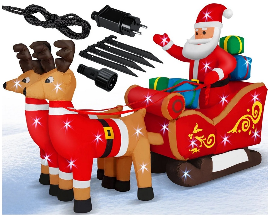 Завдяки вбудованій тихій електричній повітродувці Санта та його сани наповнюються повітрям лише за кілька хвилин. Просто підключіть його! З настанням темряви прикраса виглядає феноменально завдяки 6 вбудованим світлодіодам, які освітлюють всю фігуру та створюють незабутню атмосферу.