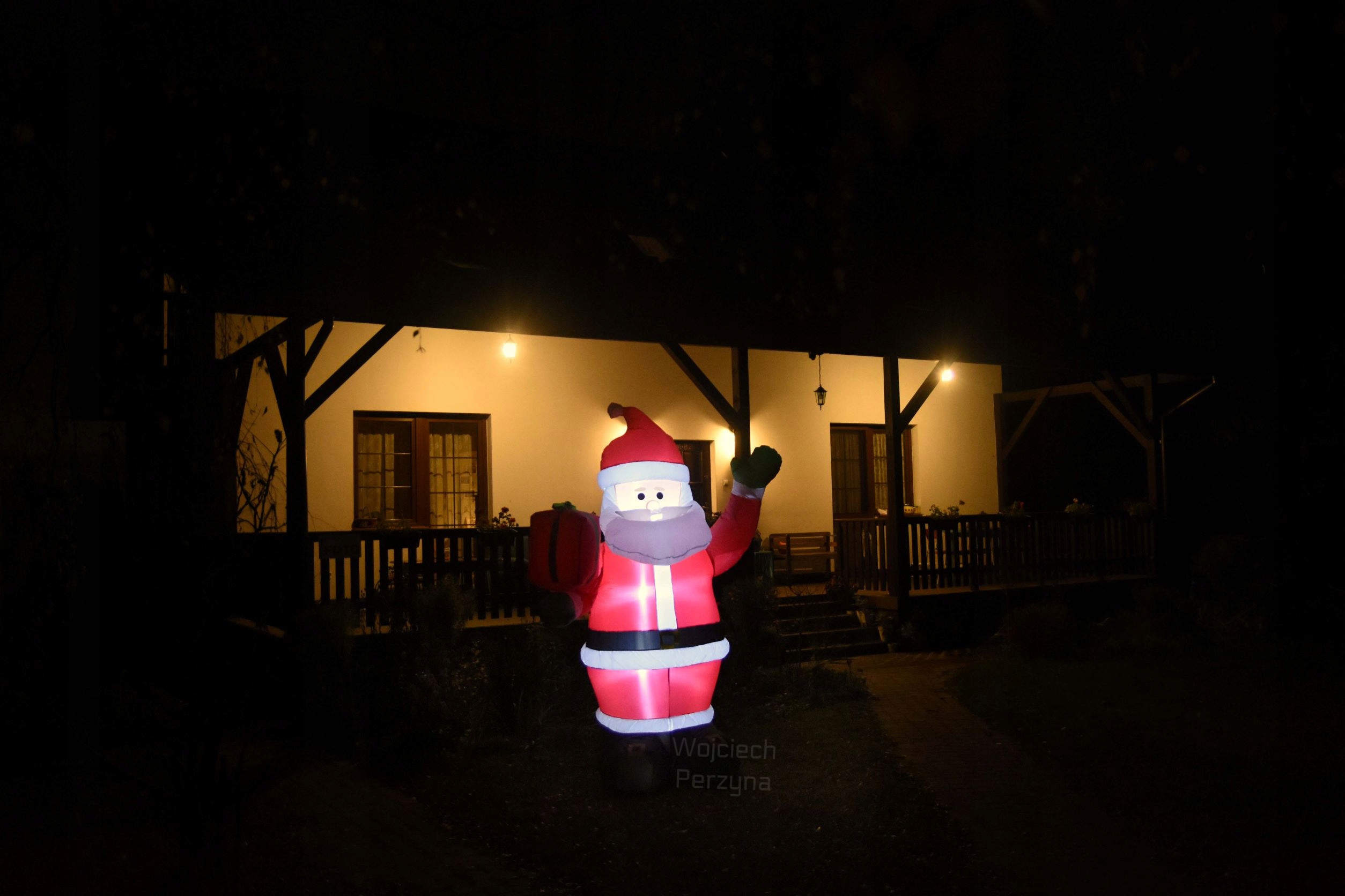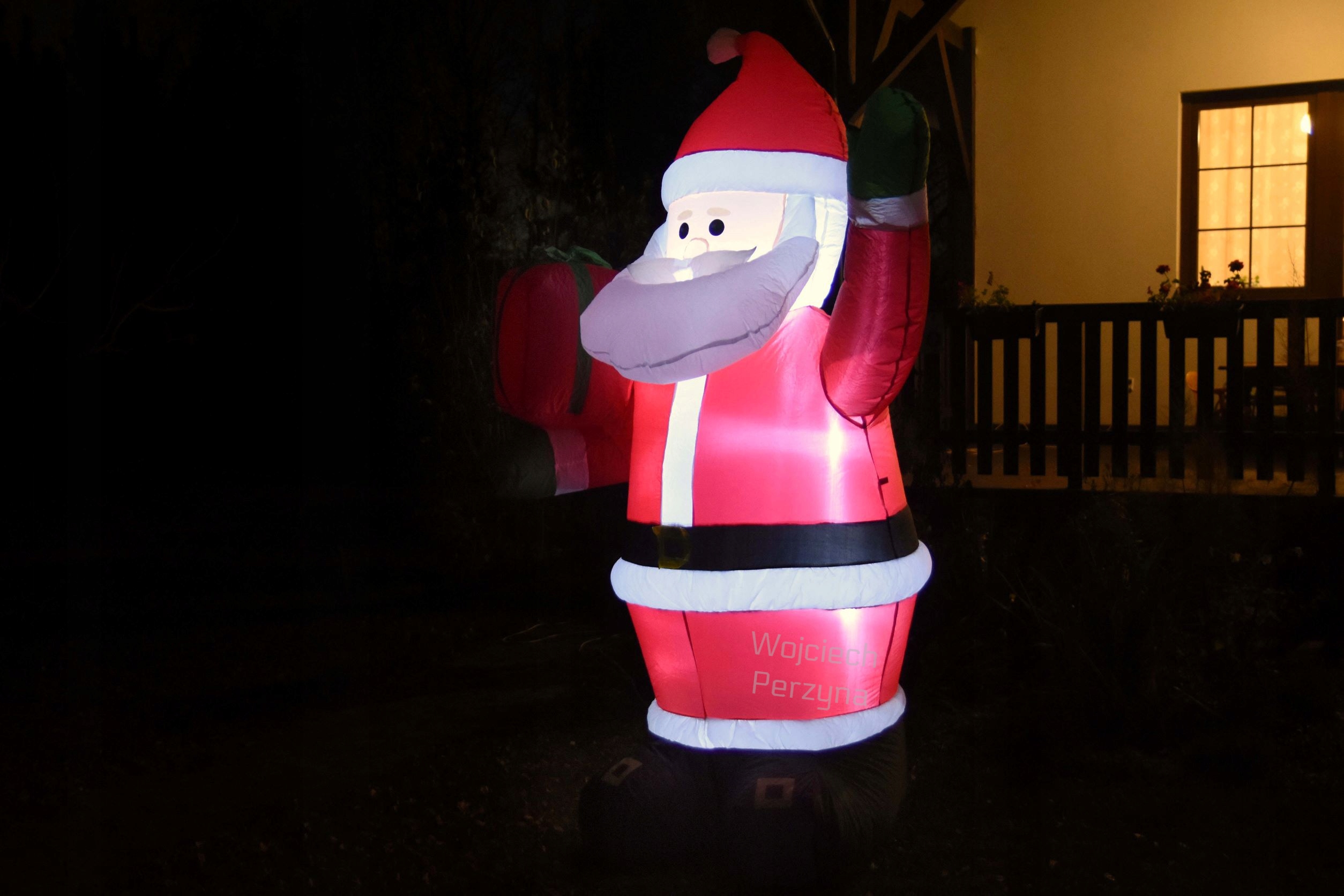 Кожен Санта-Клаус оснащений блоком живлення, який знижує напругу, що протікає в надувці, з небезпечних 230 вольт до абсолютно нешкідливих для нашого організму 12 вольт