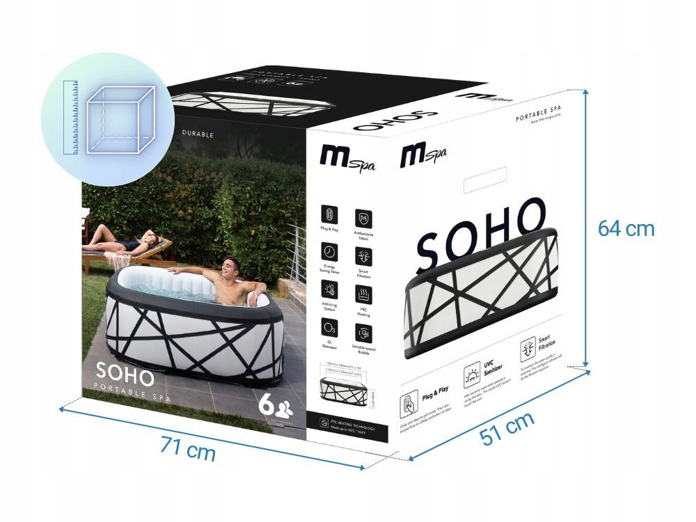 надувний спа - ідеальне рішення для тих, хто цінує розслаблення та зручність у власному саду чи на терасі. Розроблений для зручності використання, він пропонує ряд функцій, які збільшують комфорт використання та гарантують незабутні моменти розслаблення. Нижче ви знайдете ключові функції та функції , які відрізняють продукт.